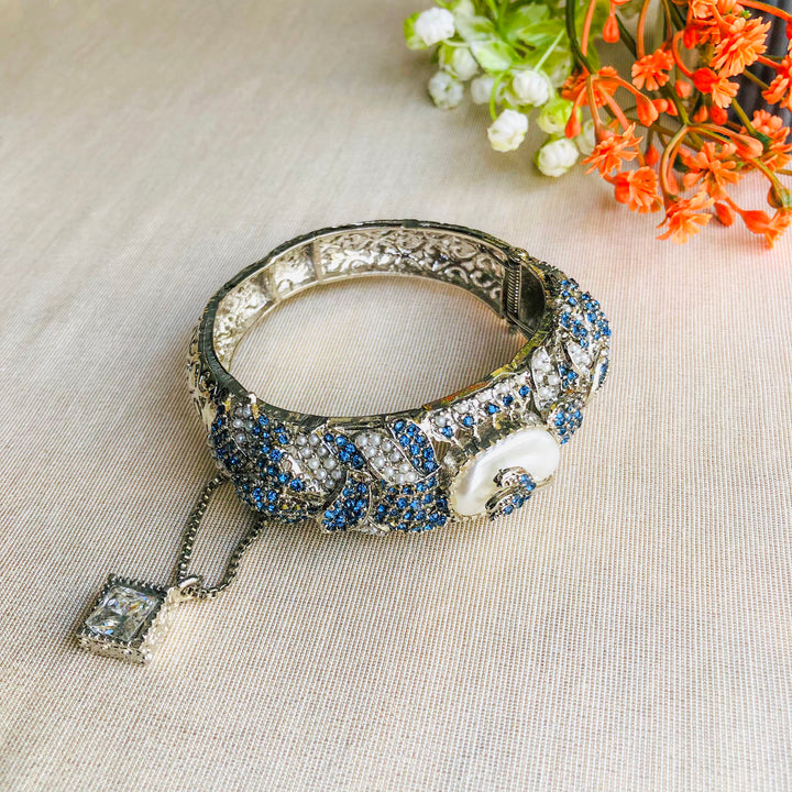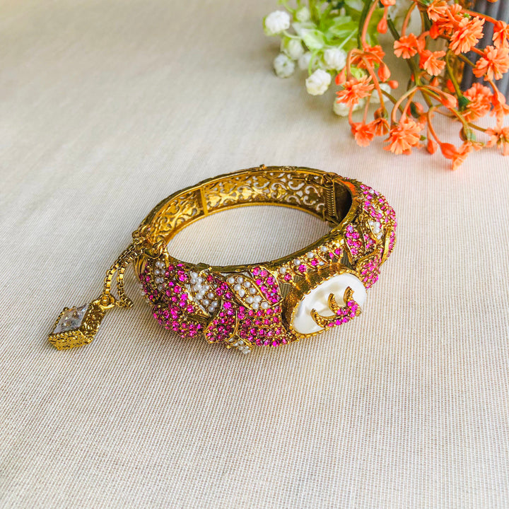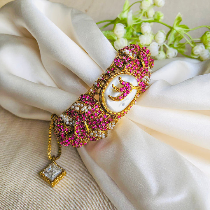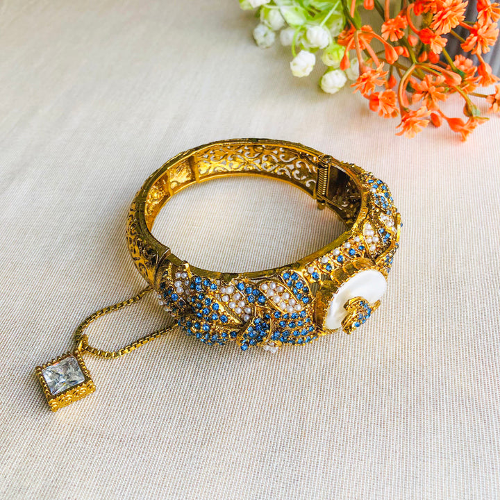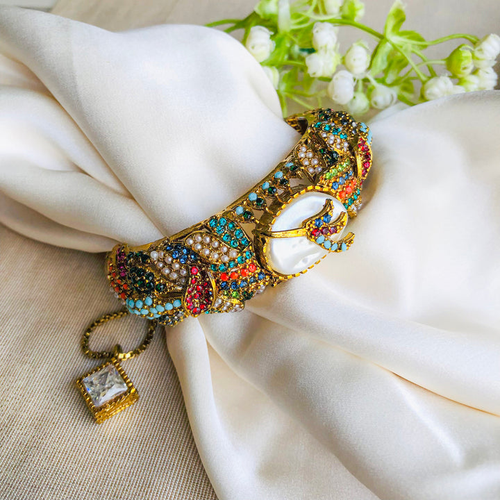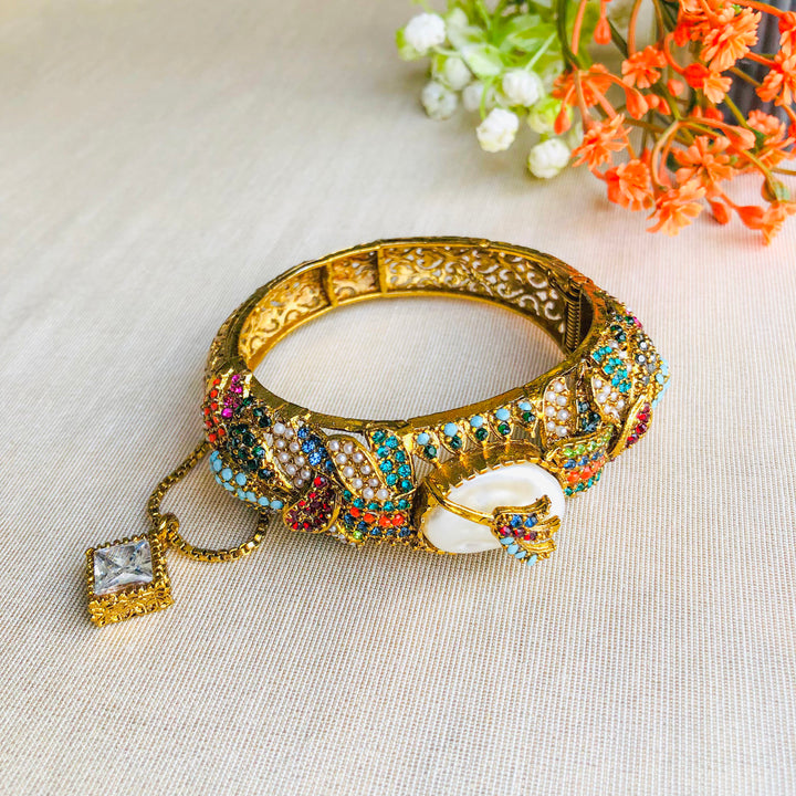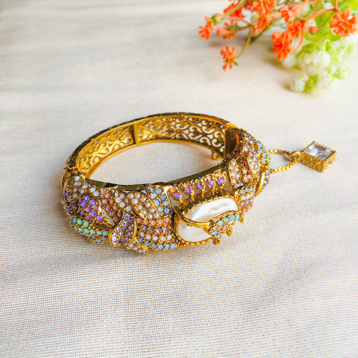 Add a burst of brilliance to your look with the Gulrang Bangles – a true celebration of artistry and vibrant design. Featuring a dazzling mix of hand-embellished stones in vivid hues, paired with intricate detailing and a center pearl motif, this bangle captures the spirit of festivity and culture. Available in both golden and silver polish, it pairs beautifully with traditional or fusion wear.