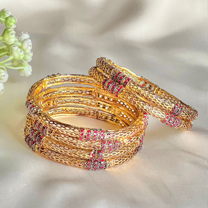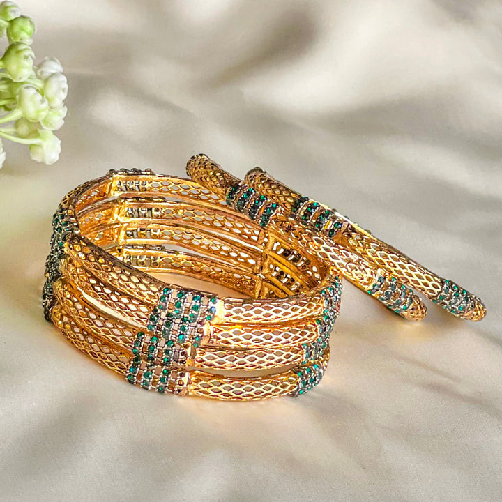 The design features a unique, intricate lattice pattern across the entire band, creating a dynamic texture of light and shadow. This golden weave is delicately punctuated by small, luminous accents, set within miniature, multi-hued clusters that catch the light with subtle sparkle. The antique gold-toned finish lends a rich, heirloom quality to the set, making these bangles perfect for layering or for wearing as a standalone statement of fine, textural artistry.