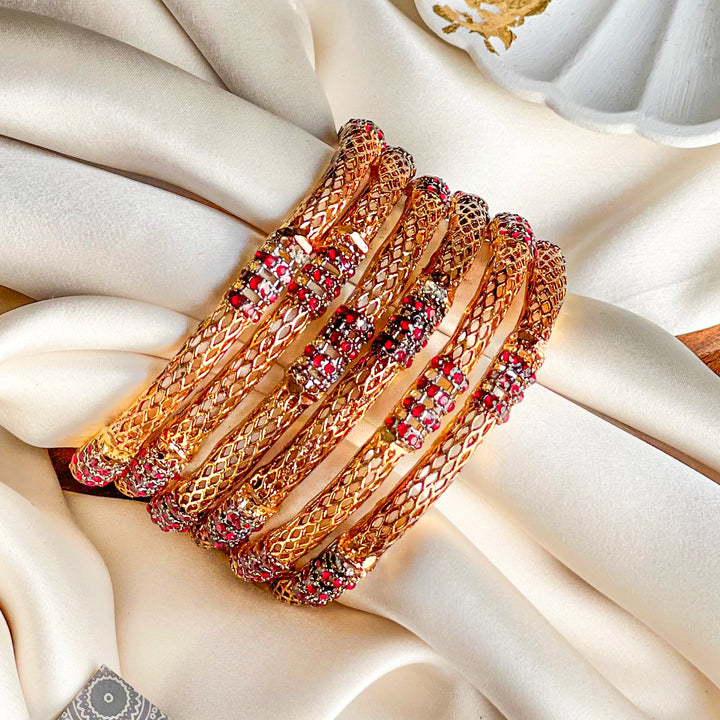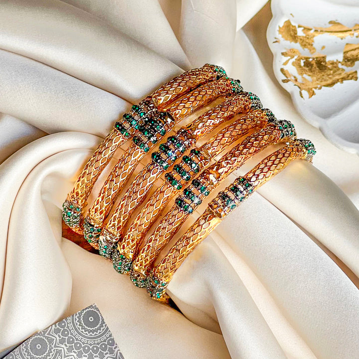Khanak, the name for the gentle, melodic sound of traditional bangles, captures the rhythmic poetry of adornment. This set is a beautifully woven tapestry of light and heritage, evoking the feeling of sunlit antique gold worked into fine, intricate textures. They are designed to encircle the wrist with a quiet, confident grace, celebrating a feminine elegance that is both detailed and effortless.