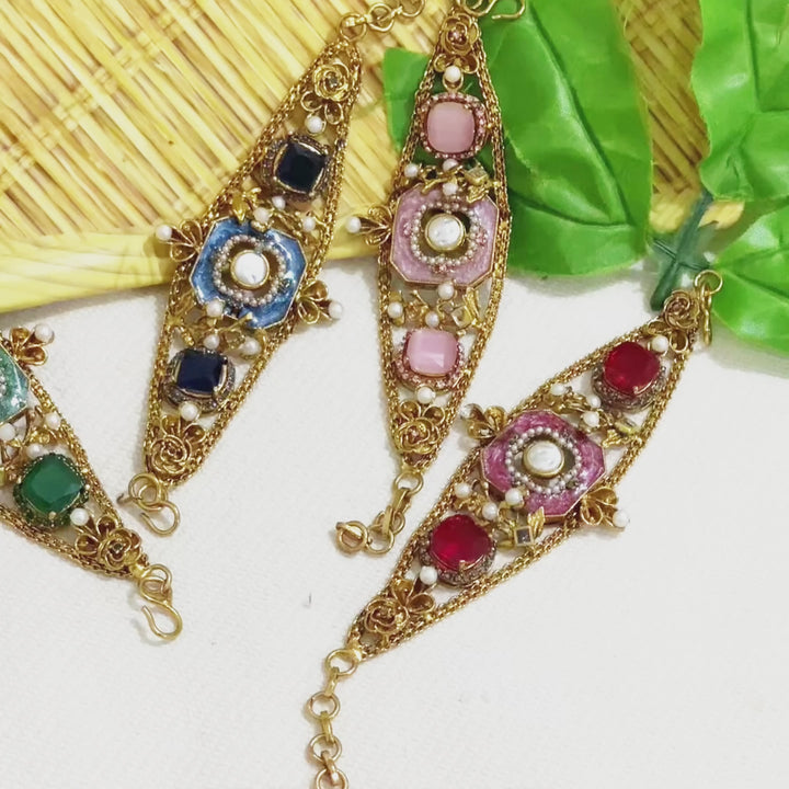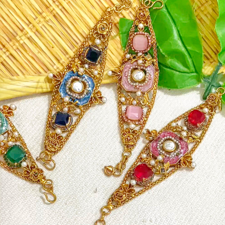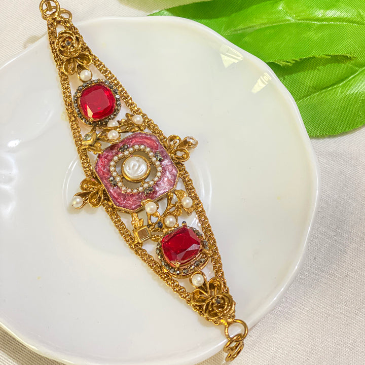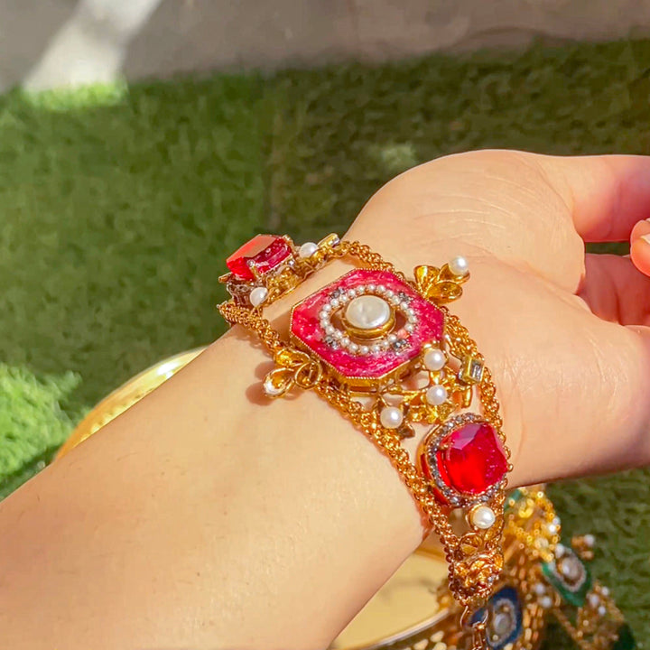 The Gulnaar Noor Gemstone Bracelet is a stunning fusion of tradition and elegance, designed to add a regal touch to your jewelry collection. Crafted with intricate gold-tone metalwork, this bracelet features radiant red gemstones, delicate pearls, and fine detailing that reflect timeless grace. Whether worn for a festive occasion or as a statement accessory, this piece exudes sophistication and charm.