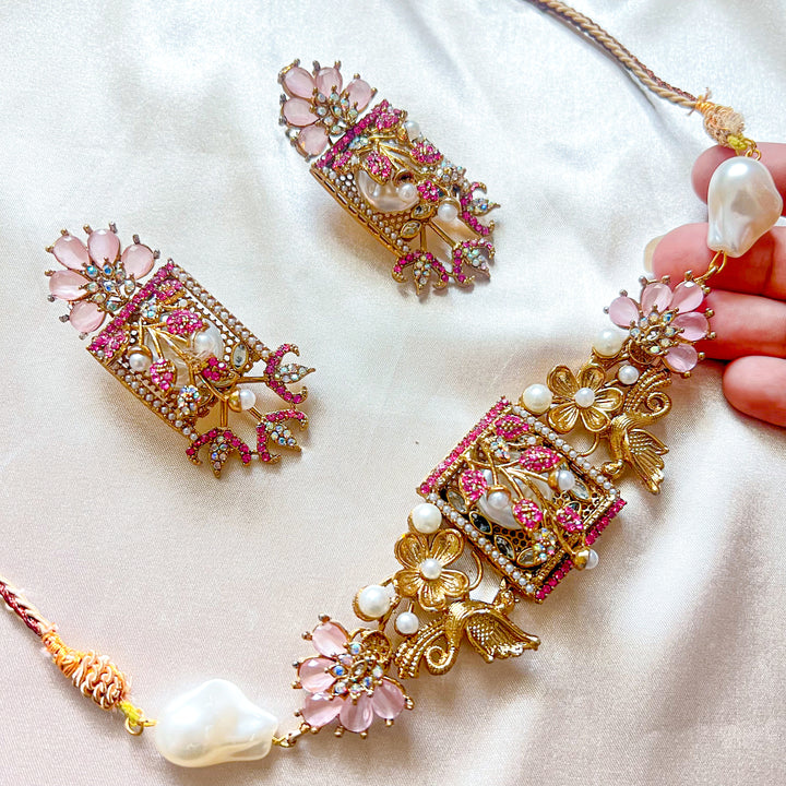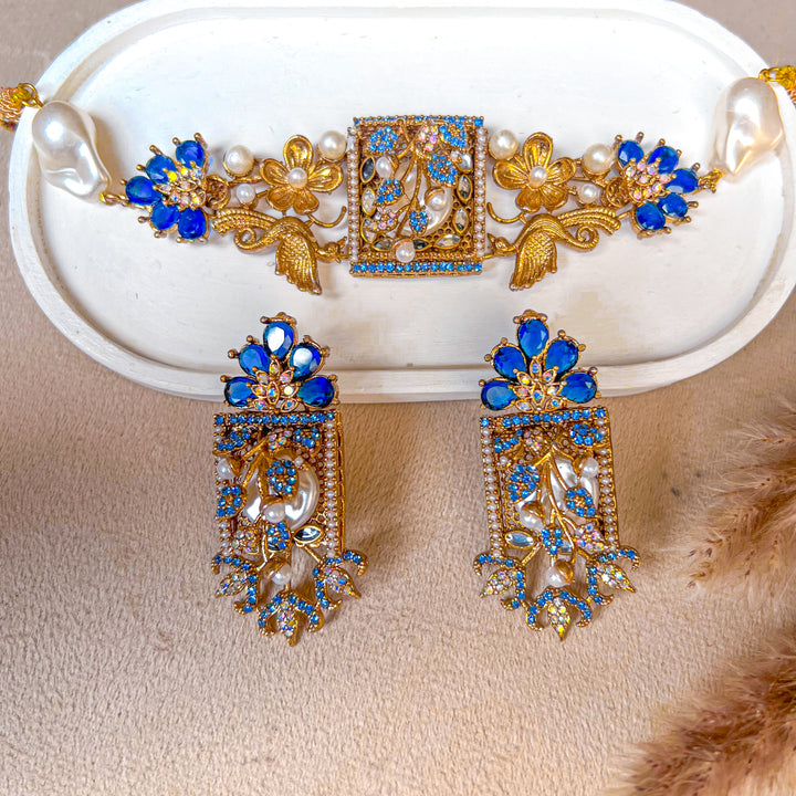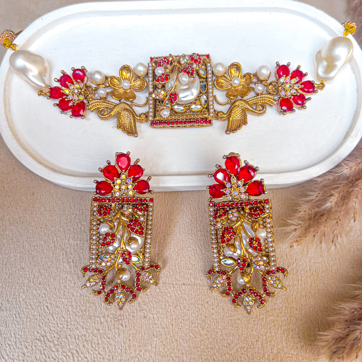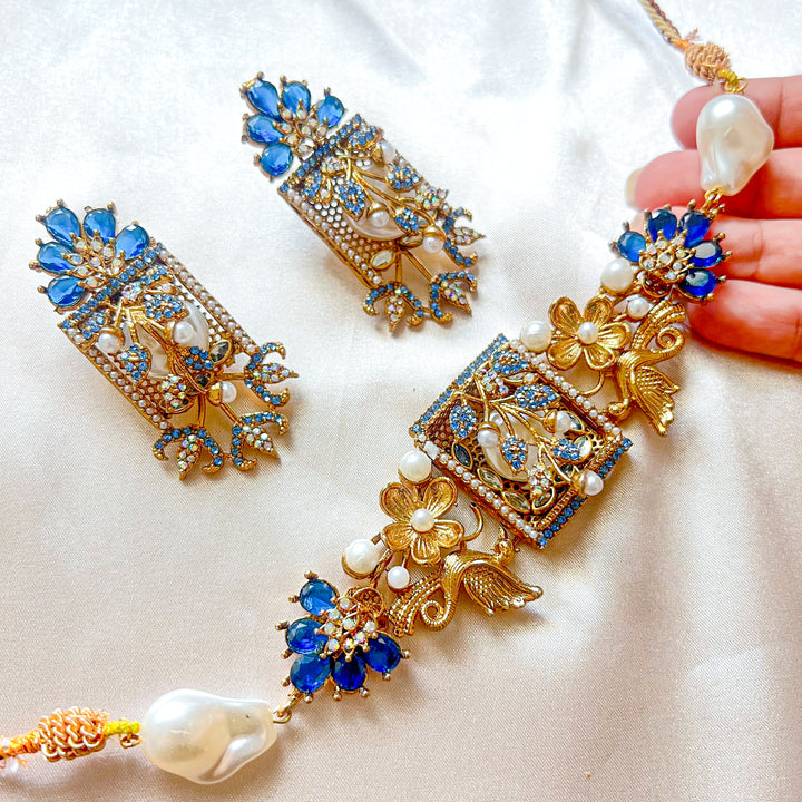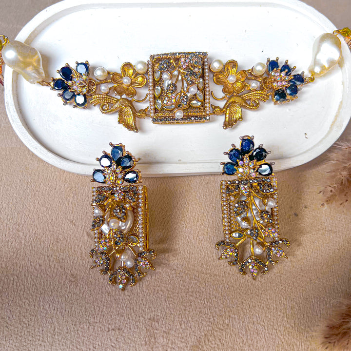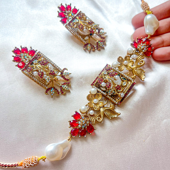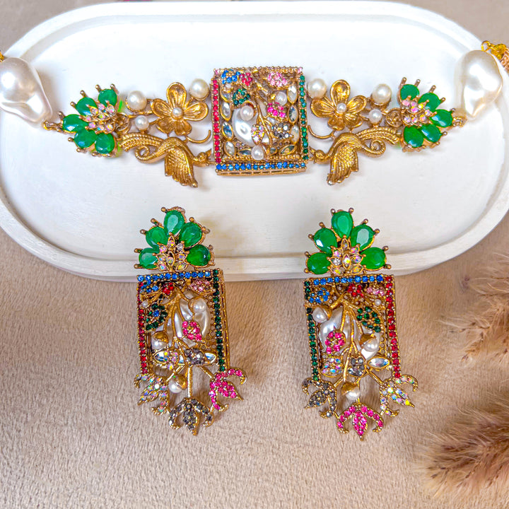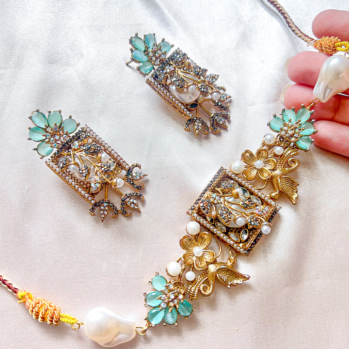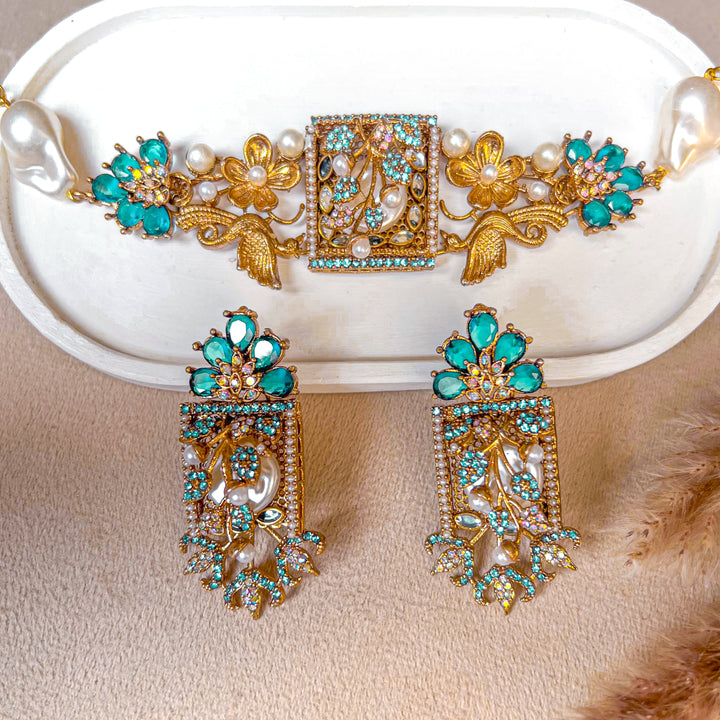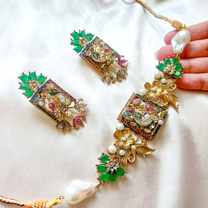 Step into an era of poetic elegance with the Umra-o-Jaan Choker Set. This regal set features an intricately designed choker with floral and bird motifs, adorned with pearls, crystals, and deep-toned embellishments. The detailed craftsmanship brings a Mughal-inspired charm that makes this set perfect for weddings, mehndi, and formal festive wear.