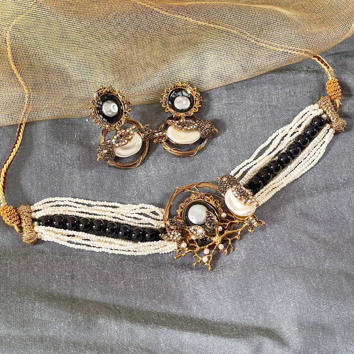 A central antique gold motif adorned with a glossy black stone, crescent pearl detailing, and sparkling rhinestone embellishments