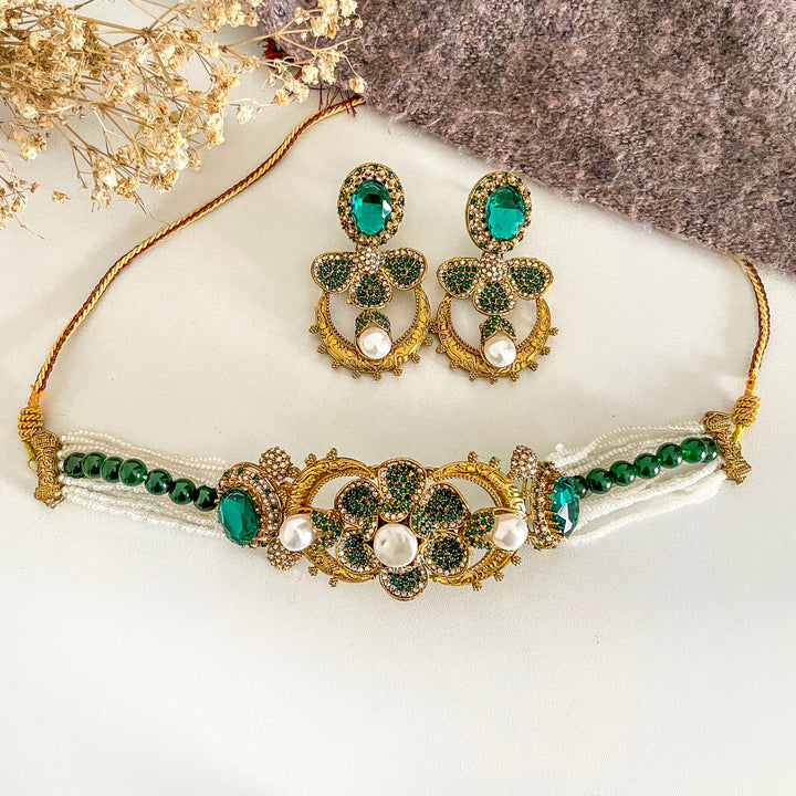 The choker unveils a symphony of floral motifs, each petal sculpted with meticulous pavé work, embracing luminous pearl-like orbs at its heart. Multi-strand beads flow like gentle rivers on either side, framing the centerpiece in balance and grace. The accompanying earrings echo this harmony—crescent arcs crowned with blossoms shimmer as if dipped in color and light.