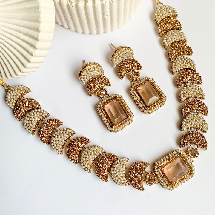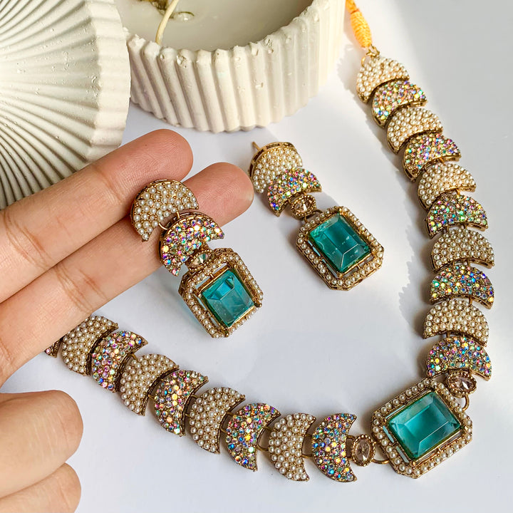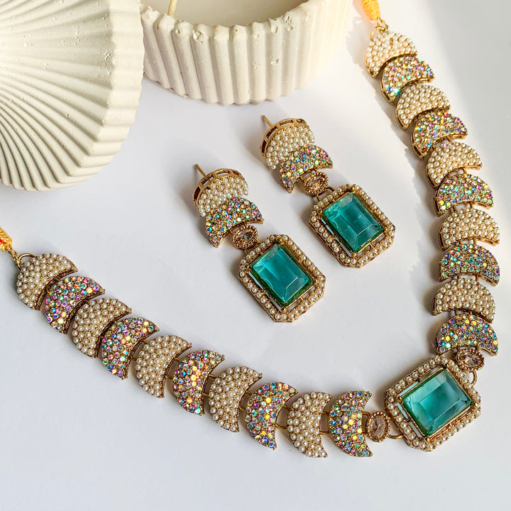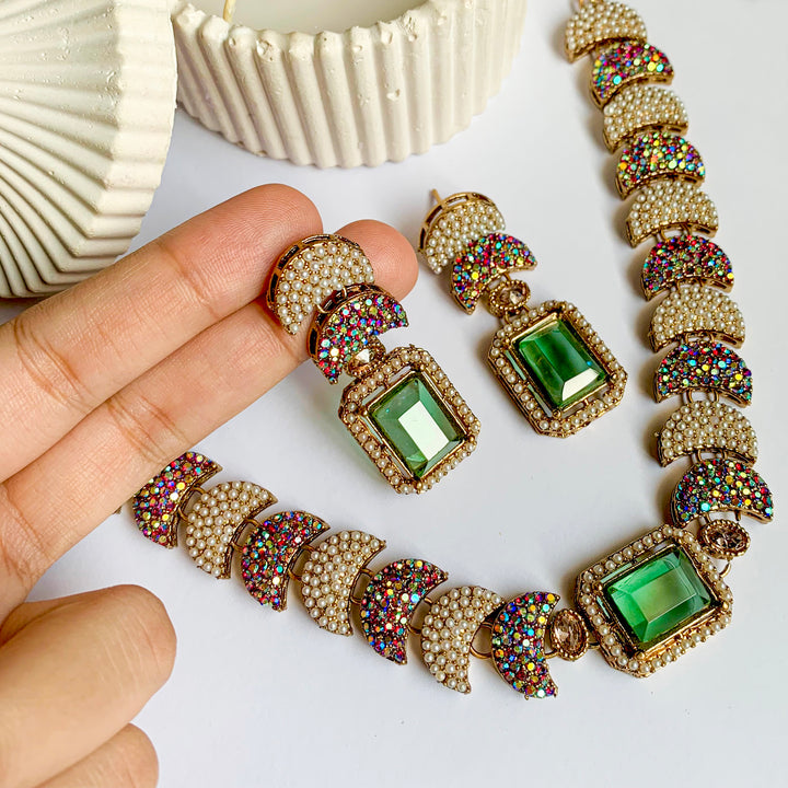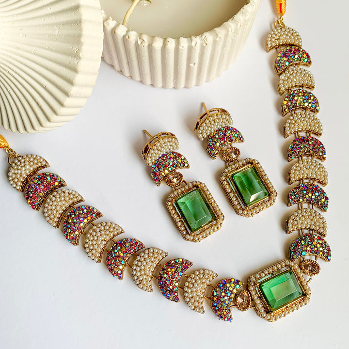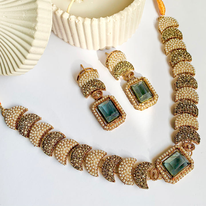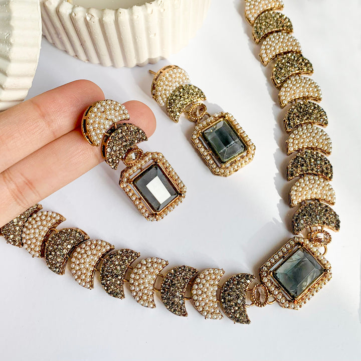 Turn heads with the majestic elegance of the Dur-e-Fishan Necklace Set – a stunning fusion of modern glamour and traditional artistry. This graceful set features a crescent-motif necklace paired with striking rectangular stone earrings, making it a perfect choice for weddings, festive events, or formal soirées.