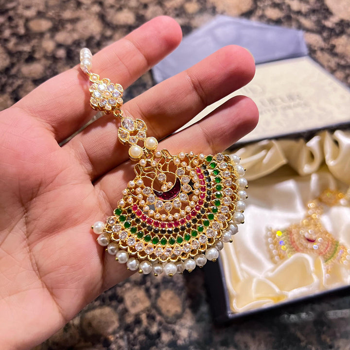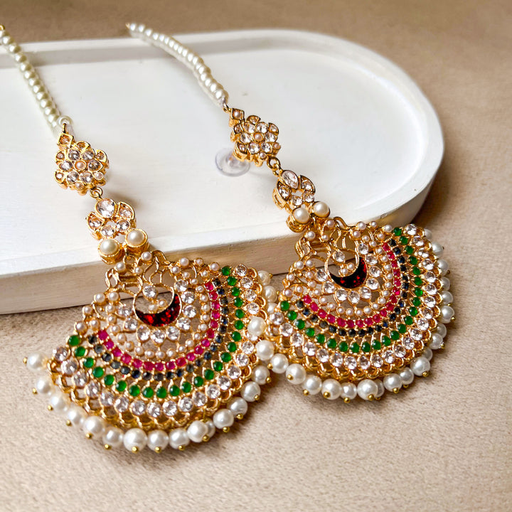 The Gul-e-Hina – ER-101 earrings are a beautiful pair that showcases traditional elegance with a touch of modern flair. These earrings feature a fan-shaped or semi-circular pendant, adorned with intricate designs that may include Kundan or Polki settings, synthetic emerald stones, and delicate pearl accents. The gold-plated base enhances the richness of the stones and pearls, creating a captivating and regal look. These earrings are designed to make a statement, perfect for special occasions where you want to showcase cultural elegance.