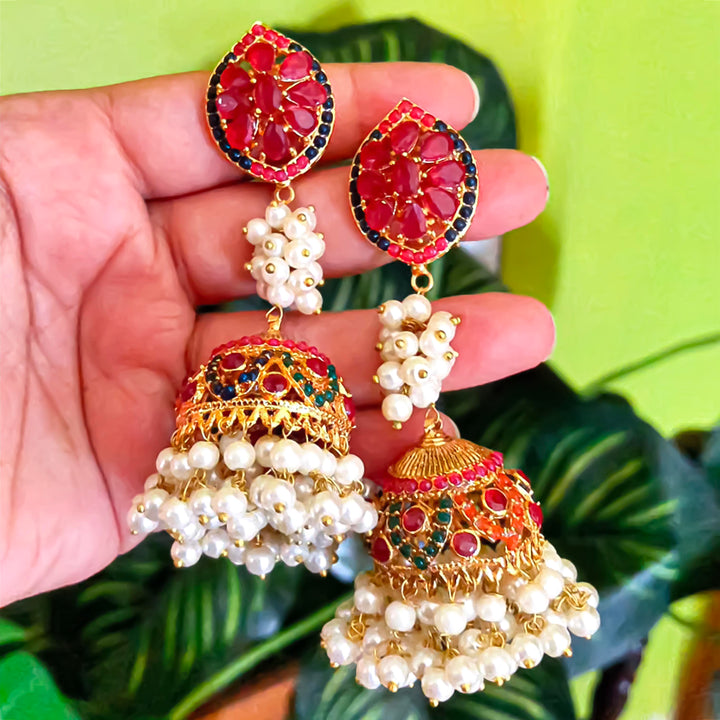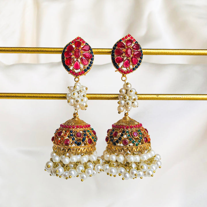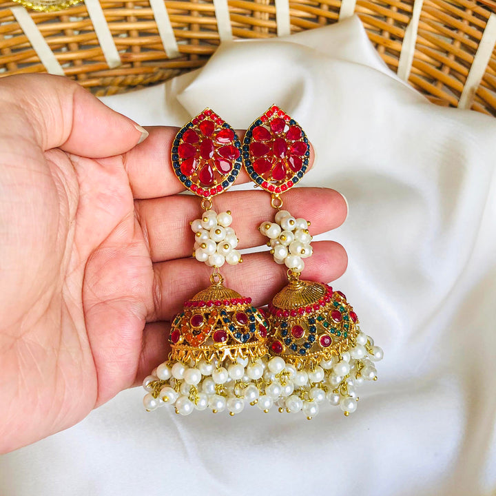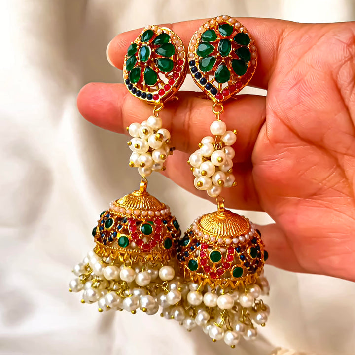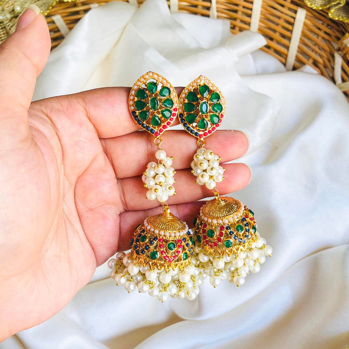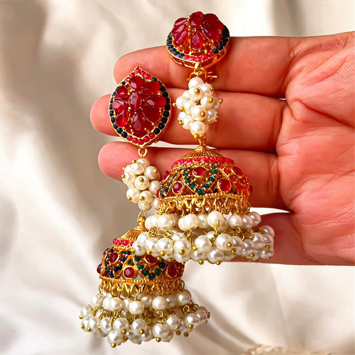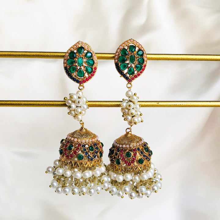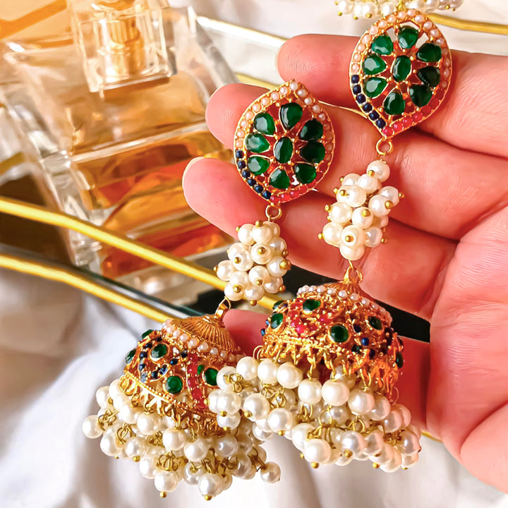 The Marjan Earrings – ER-107 embody timeless elegance through a celebration of traditional craftsmanship. Featuring a bold floral stud, delicate pearl cluster accents, and intricately adorned jhumkas, this pair brings regal charm to any ensemble. Designed with precision stone-setting and rich detailing, these earrings are ideal for weddings, festive occasions, or formal traditional wear. Available in two classic shades that complement a wide range of outfits.