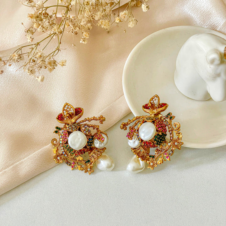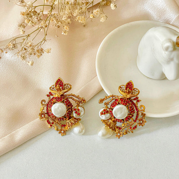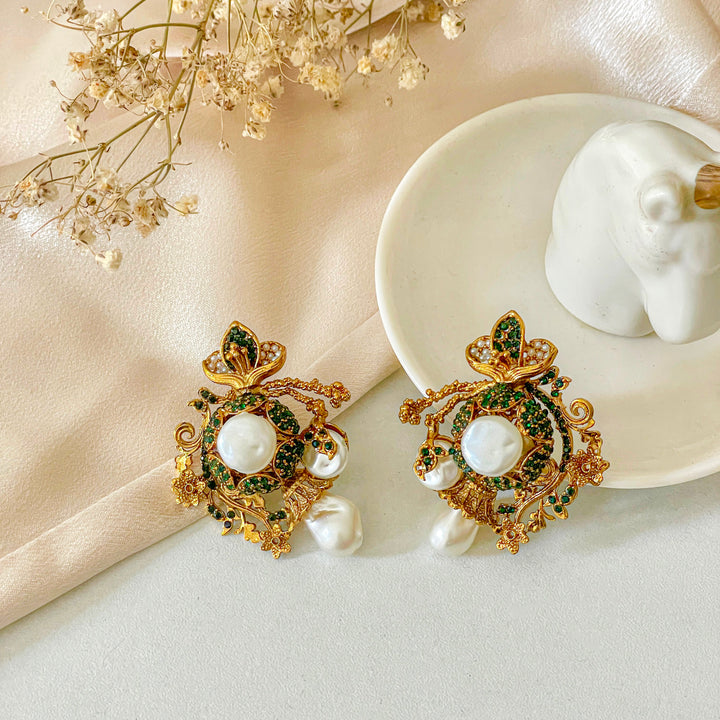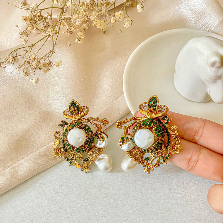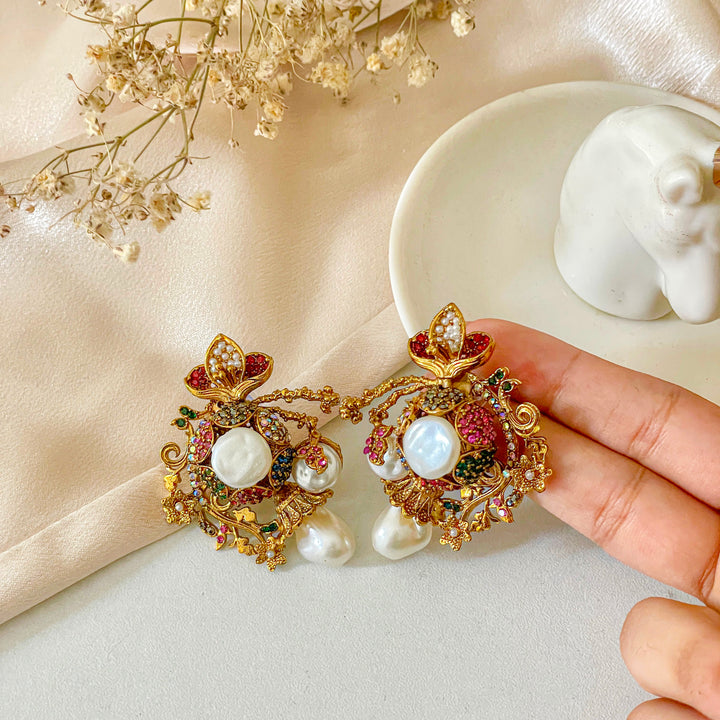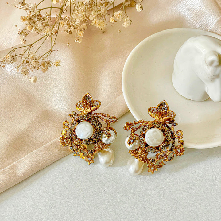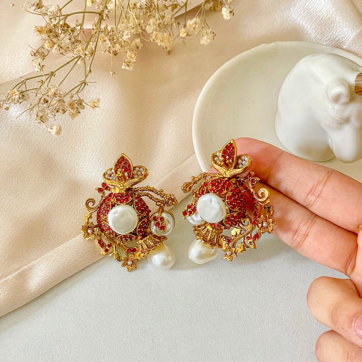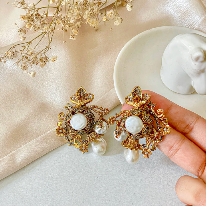 The Koh-e-Gohar – ER-108 earrings are a captivating pair that embodies intricate artistry and timeless elegance. These earrings feature a detailed, ornate design with a central focal point, often a lustrous pearl or a similarly prominent stone. The surrounding metalwork is intricately crafted with delicate patterns and embellished with smaller stones or accents. The overall design evokes a sense of traditional opulence and sophisticated charm, making them a statement piece for special occasions.