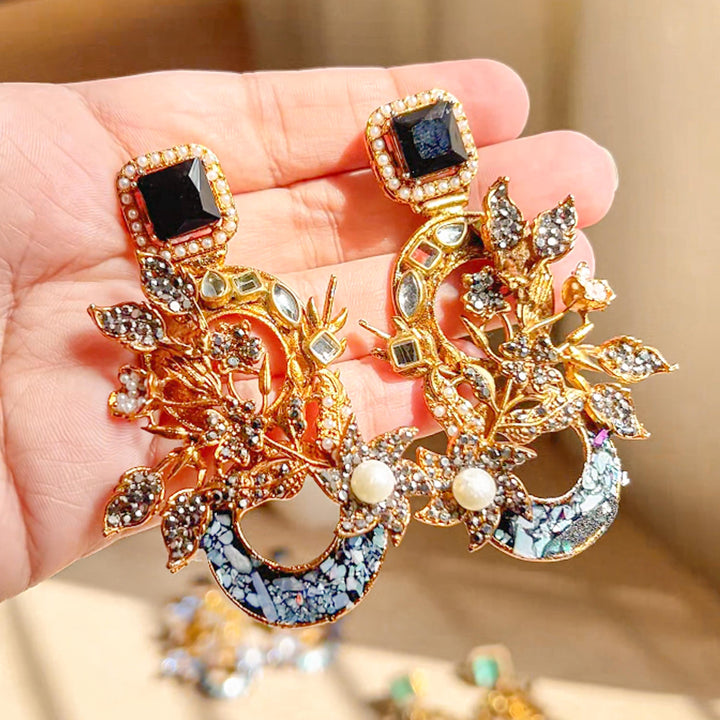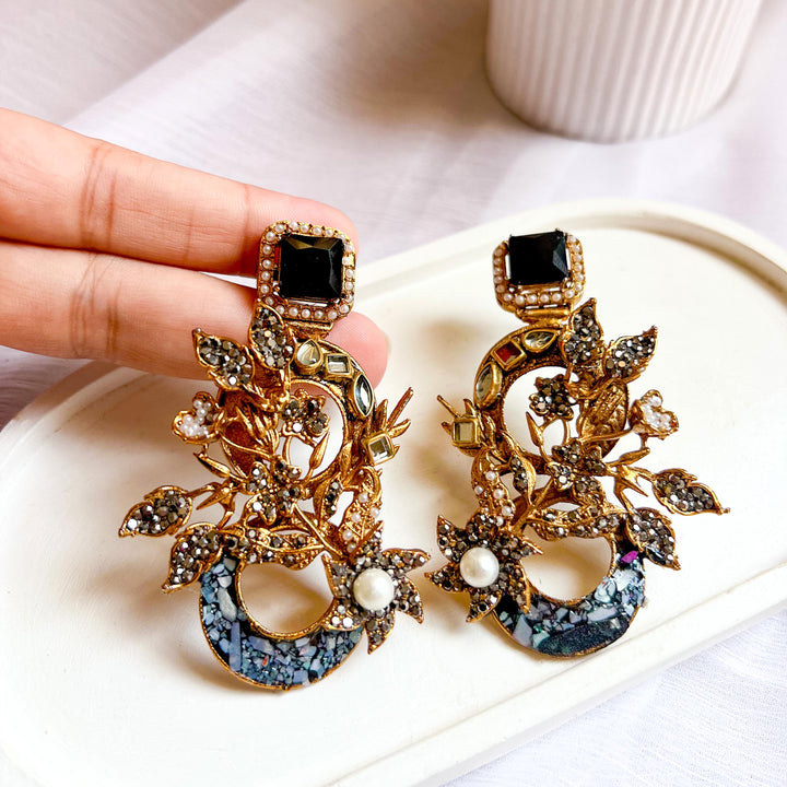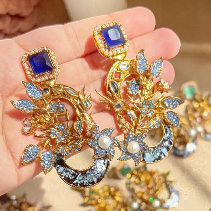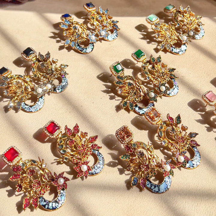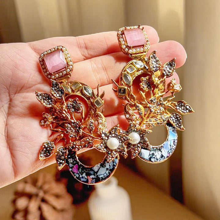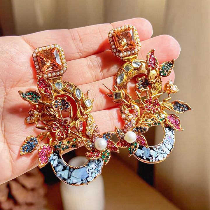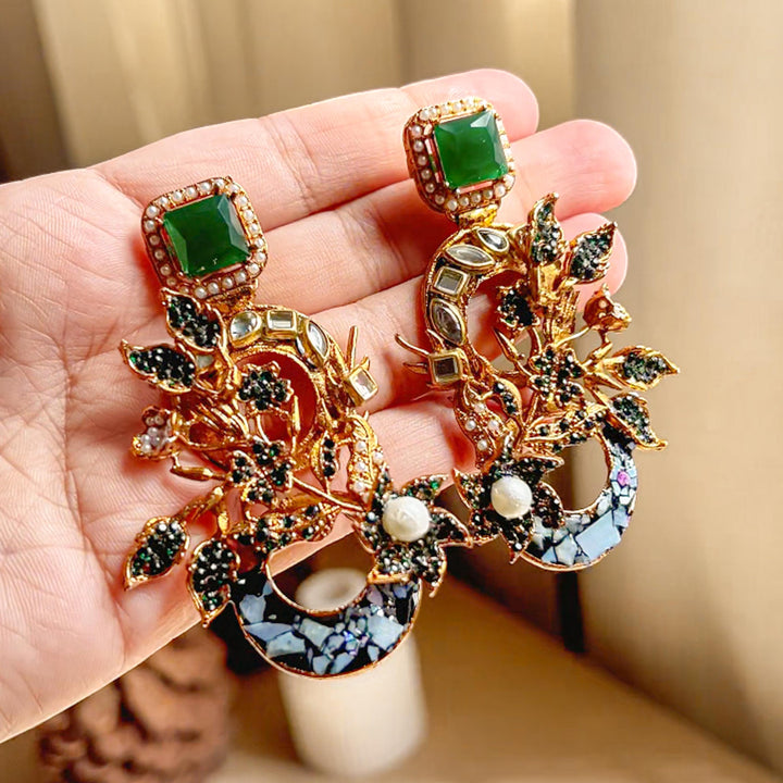 The Aks-e-Noori Earrings – ER-110 are a refined blend of traditional artistry and modern elegance. Crafted with intricate floral and crescent motifs, these statement earrings are adorned with delicate crystal work, pearls, and fine enamel accents. The antique gold-toned base enhances the overall richness of the design, making them an ideal choice for festive occasions, weddings, and formal events. Every element is thoughtfully placed to reflect timeless beauty and meticulous craftsmanship.