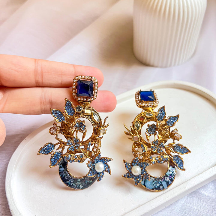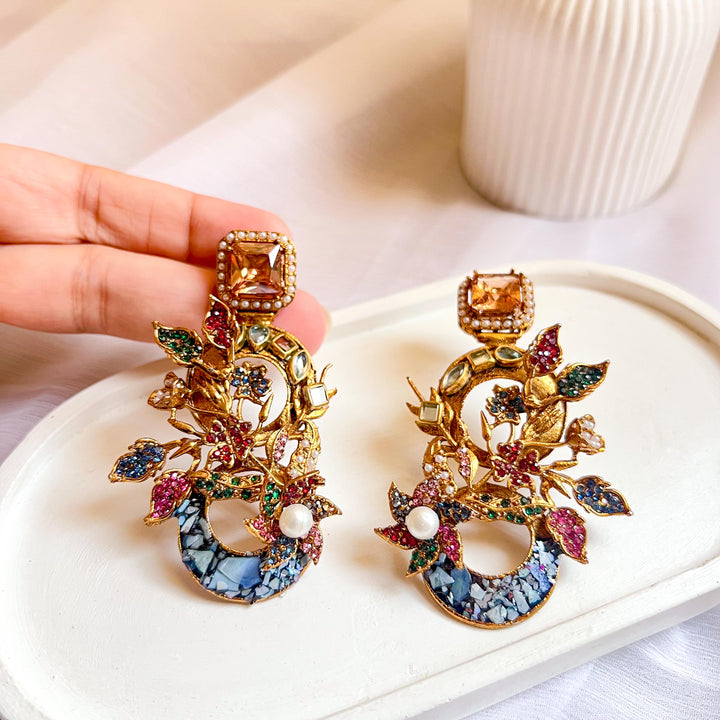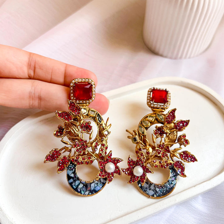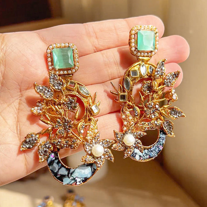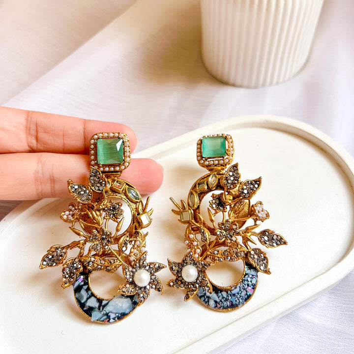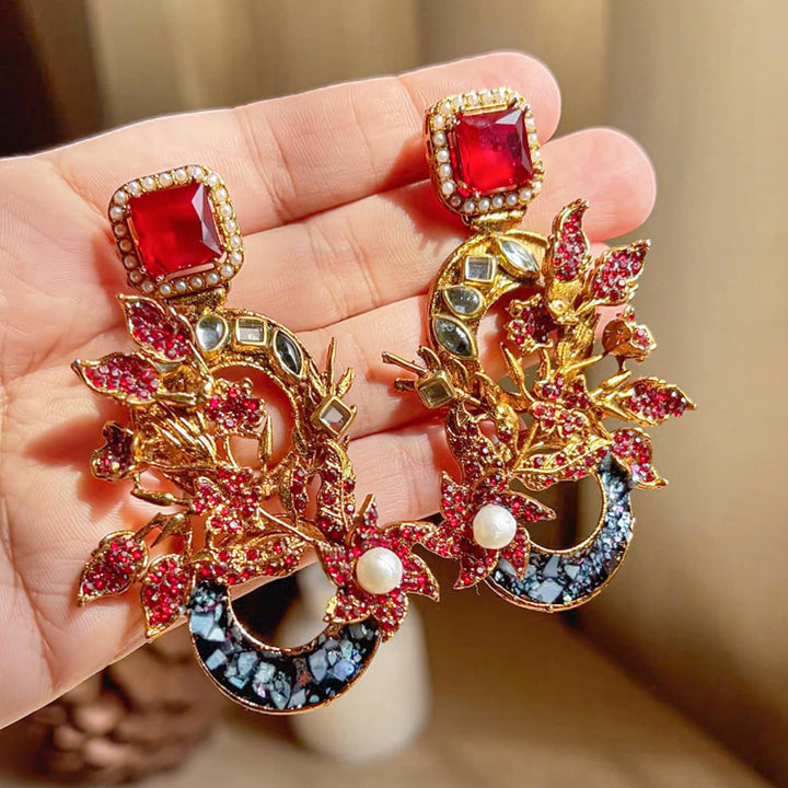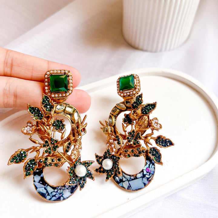 The Aks-e-Noori Earrings – ER-110 are a refined blend of traditional artistry and modern elegance. Crafted with intricate floral and crescent motifs, these statement earrings are adorned with delicate crystal work, pearls, and fine enamel accents. The antique gold-toned base enhances the overall richness of the design, making them an ideal choice for festive occasions, weddings, and formal events. Every element is thoughtfully placed to reflect timeless beauty and meticulous craftsmanship.