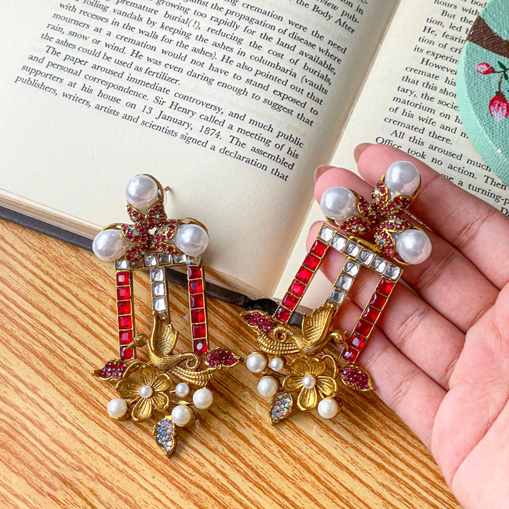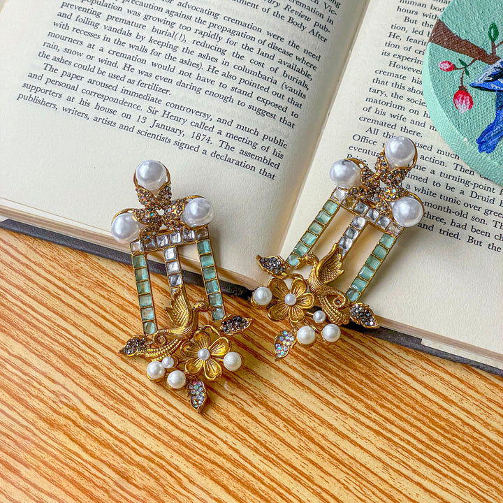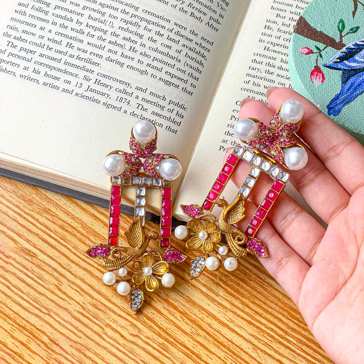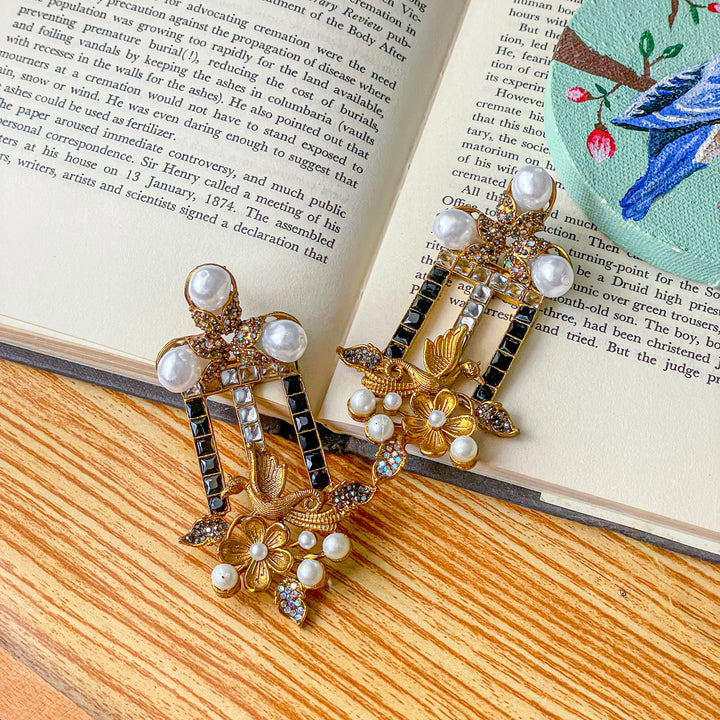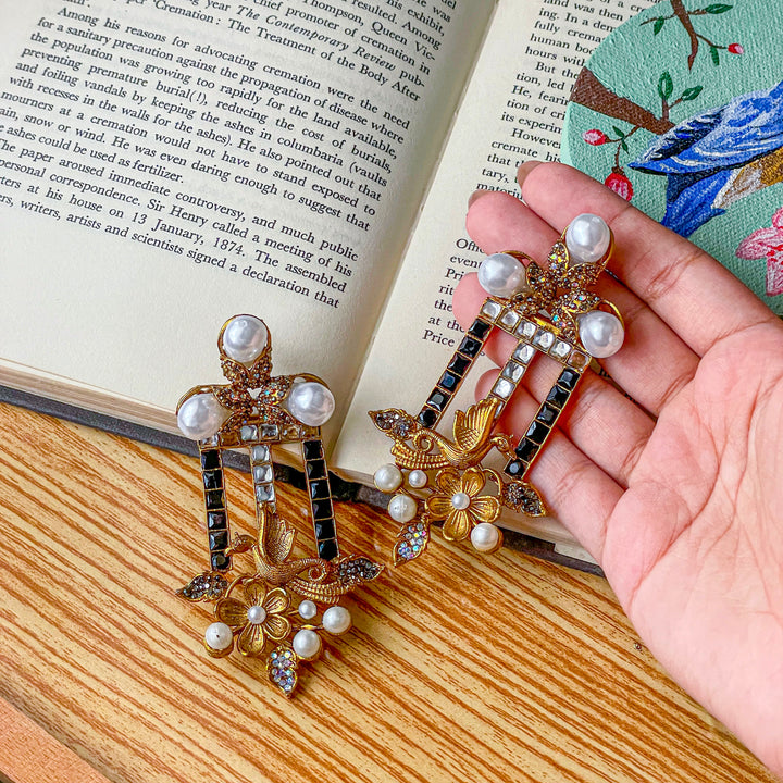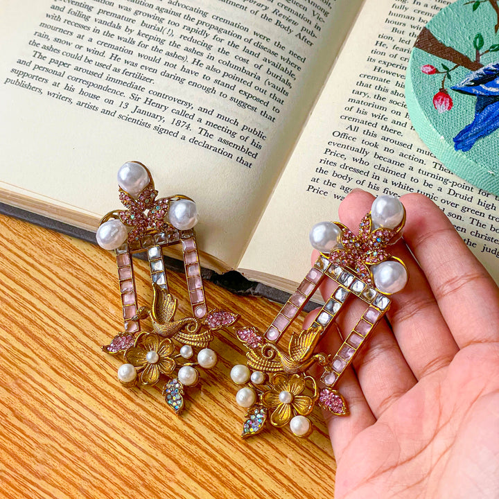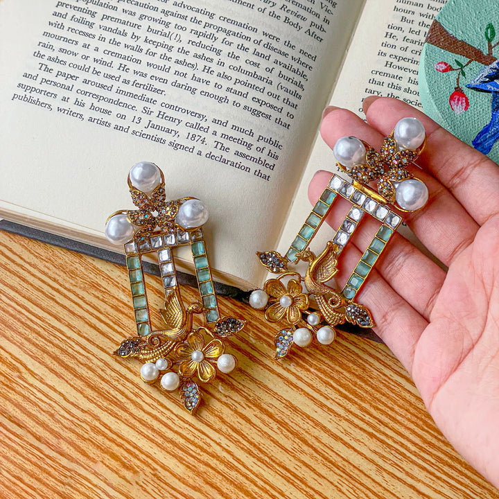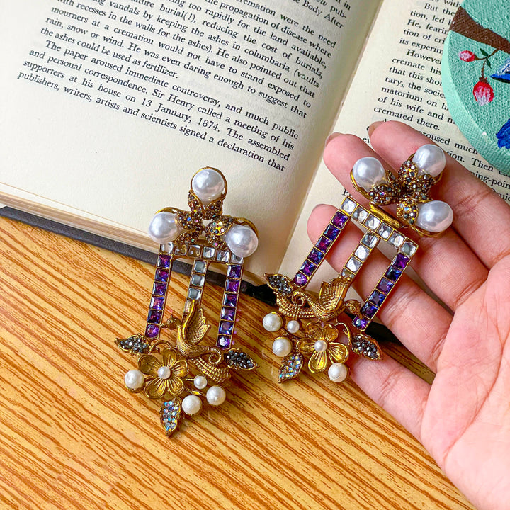 The Ayla Earrings – ER-112 are a striking pair that blends modern and ornate styles. These earrings feature a unique geometric design, often with a rectangular or square frame-like structure. Within this frame, there are often intricate embellishments, including floral motifs, bird-like elements, and sparkling stones or crystals. Pearls are also frequently incorporated, adding a touch of classic elegance. The overall design balances bold shapes with delicate details, making them a versatile choice for various occasions.
