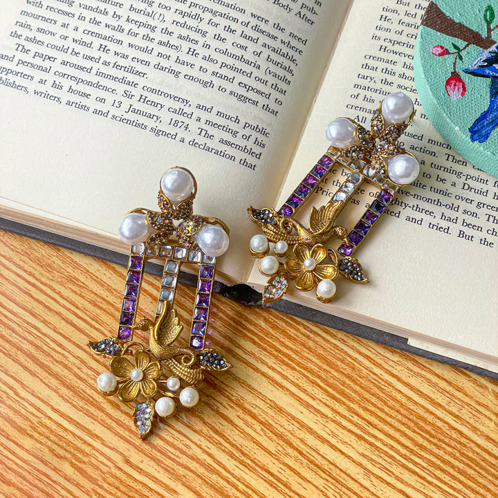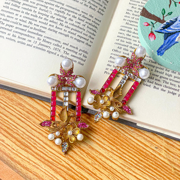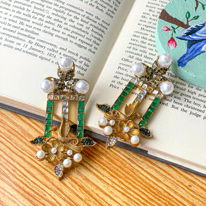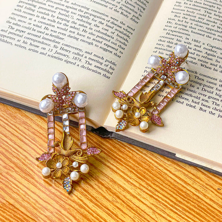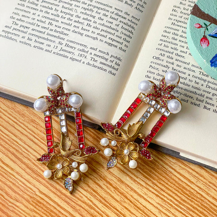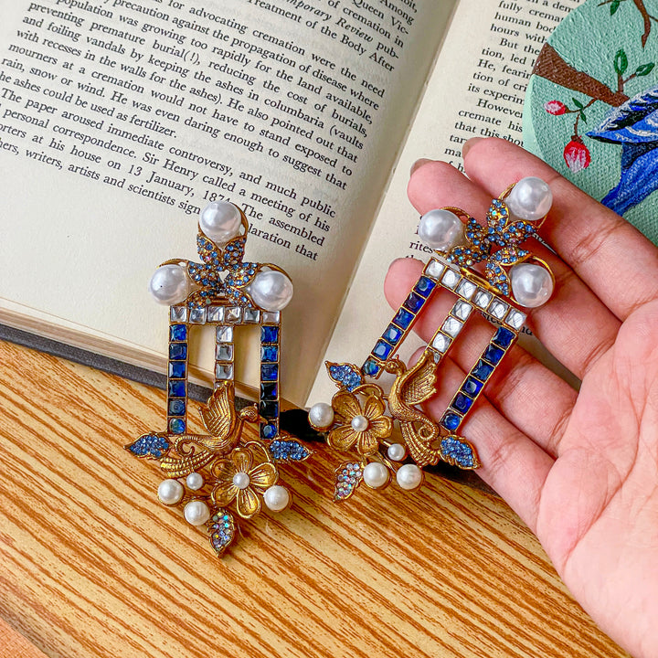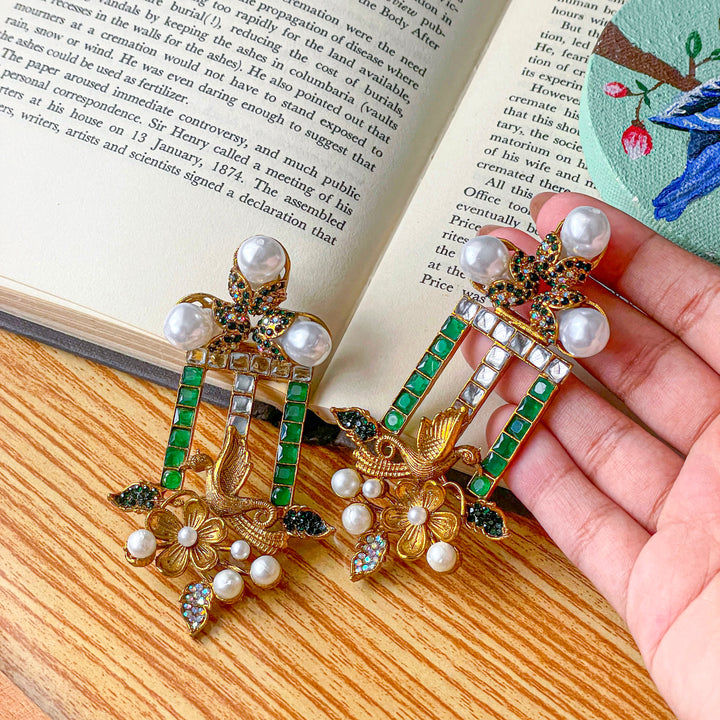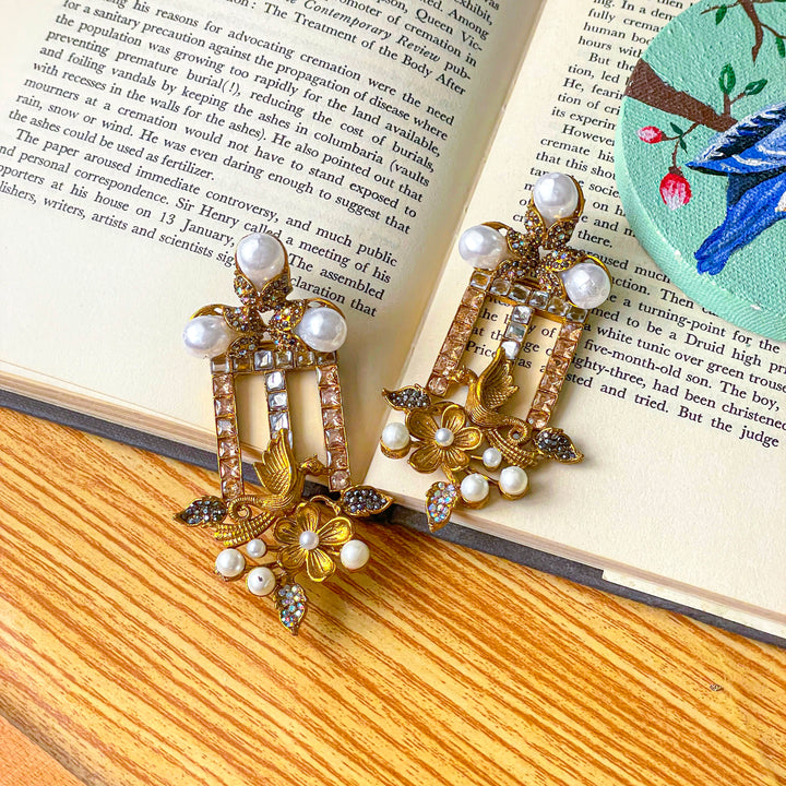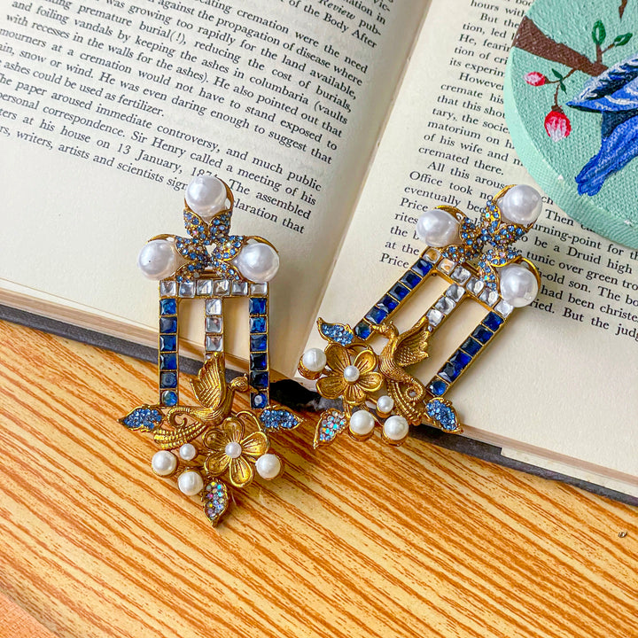 The Ayla Earrings – ER-112 are a striking pair that blends modern and ornate styles. These earrings feature a unique geometric design, often with a rectangular or square frame-like structure. Within this frame, there are often intricate embellishments, including floral motifs, bird-like elements, and sparkling stones or crystals. Pearls are also frequently incorporated, adding a touch of classic elegance. The overall design balances bold shapes with delicate details, making them a versatile choice for various occasions.