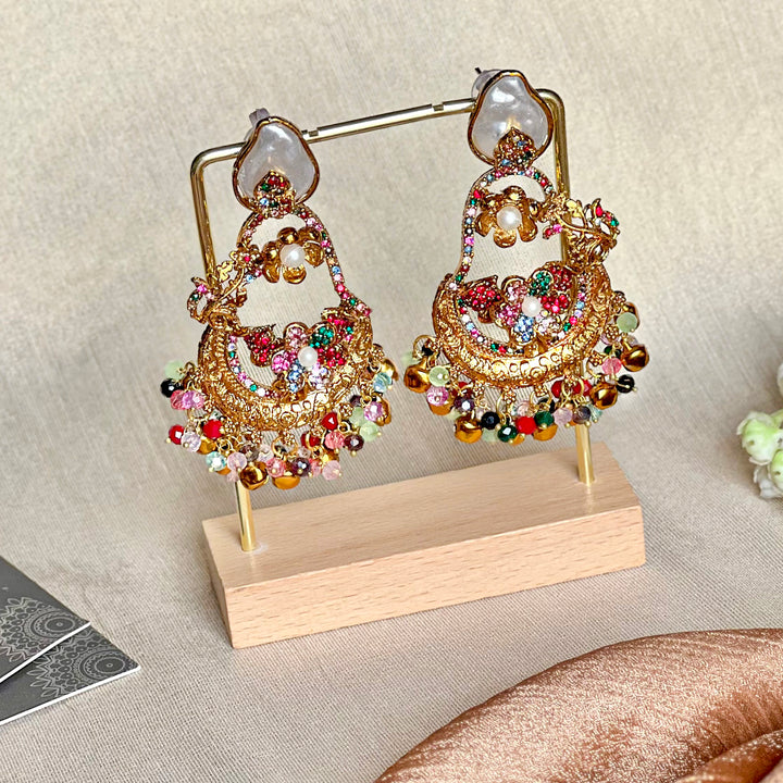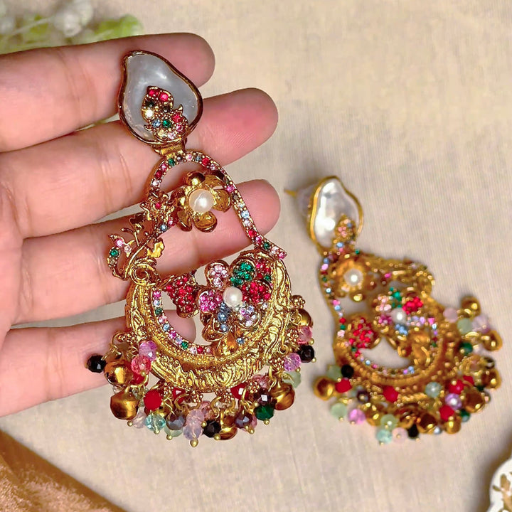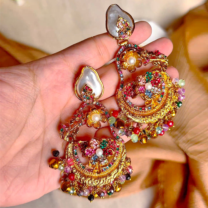 The earring begins with a graceful, flat pearl-like accent on the stud, transitioning seamlessly into a richly detailed, ornate drop. The main, gilded element features a beautifully embellished surface with intricate floral motifs and a fine mosaic of shimmering, multi-hued crystal accents. This opulent center is finished with a lively cascade of mixed beads and miniature bells that sway and chime, harmonizing the antique-finished gold-tone with vibrant, playful fluidity.