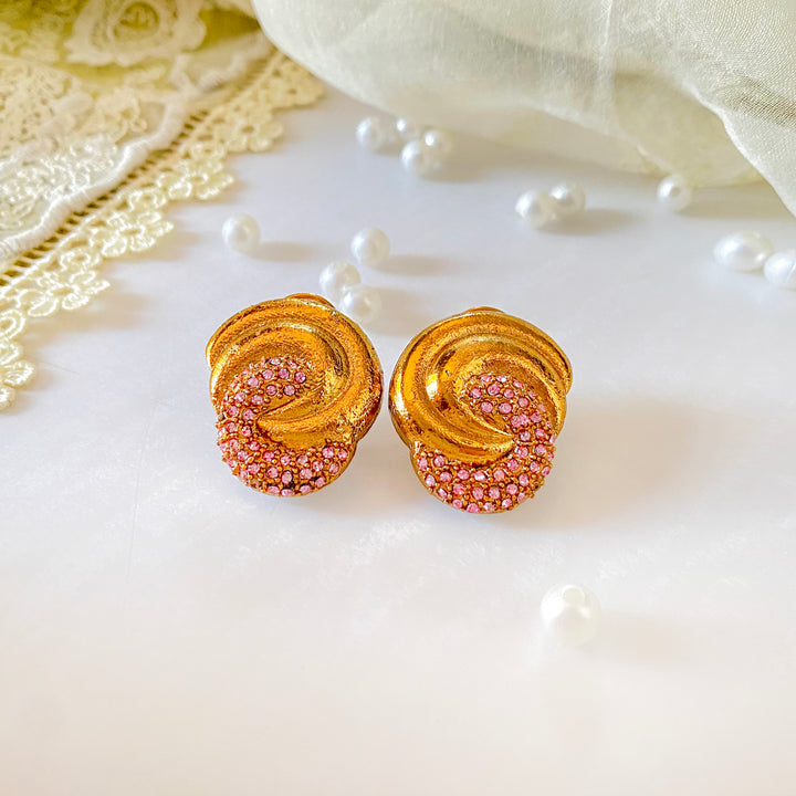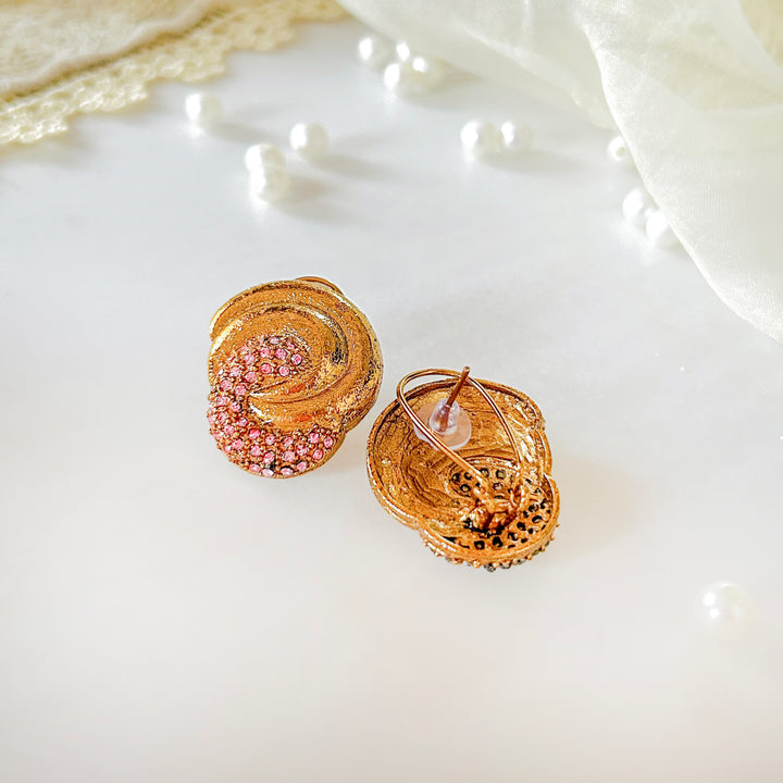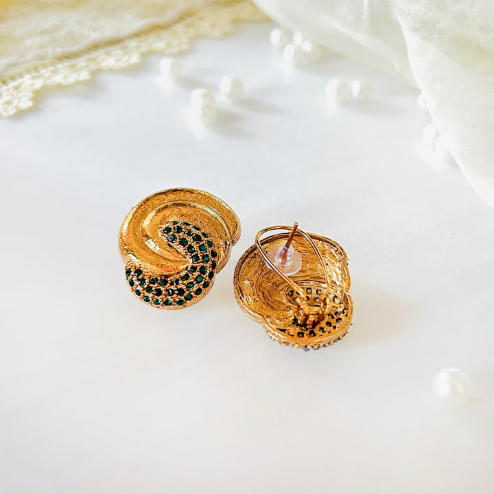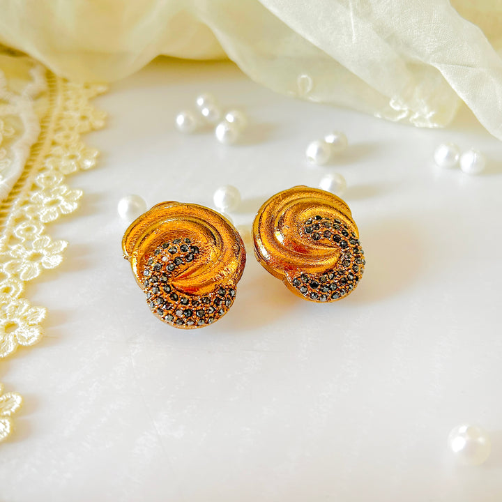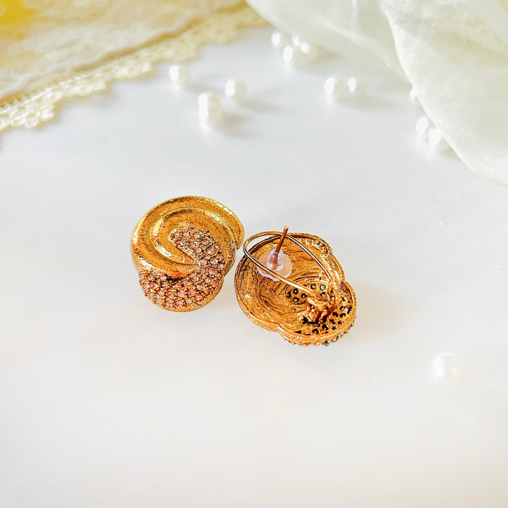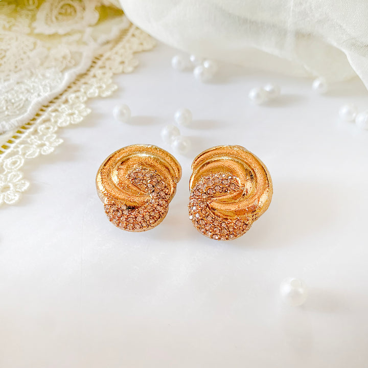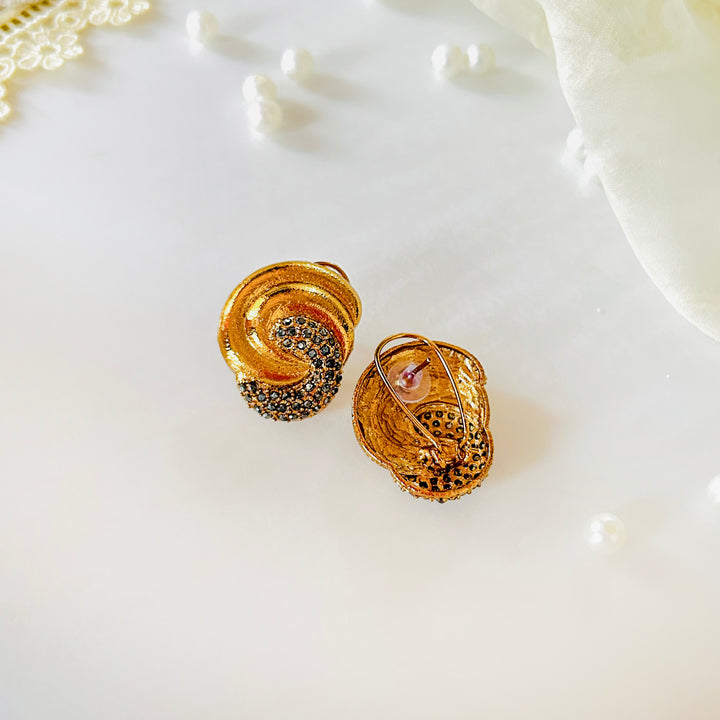 The design is anchored by a magnificent spiral motif crafted in a rich, antique gold-toned metal, creating a mesmerizing, three-dimensional texture that draws the eye. Following the curve of the spiral, a dense, luminous spray of brilliant accents is meticulously set, focusing light and providing a striking contrast to the warm texture. The robust, elegant construction ensures a comfortable statement-stud appearance, making each earring a concentrated burst of artistry and light.