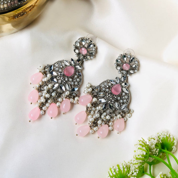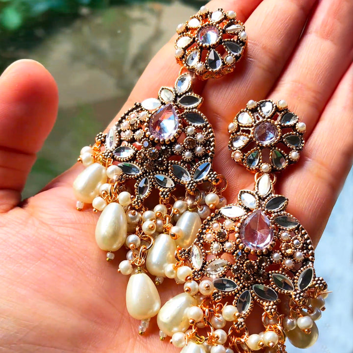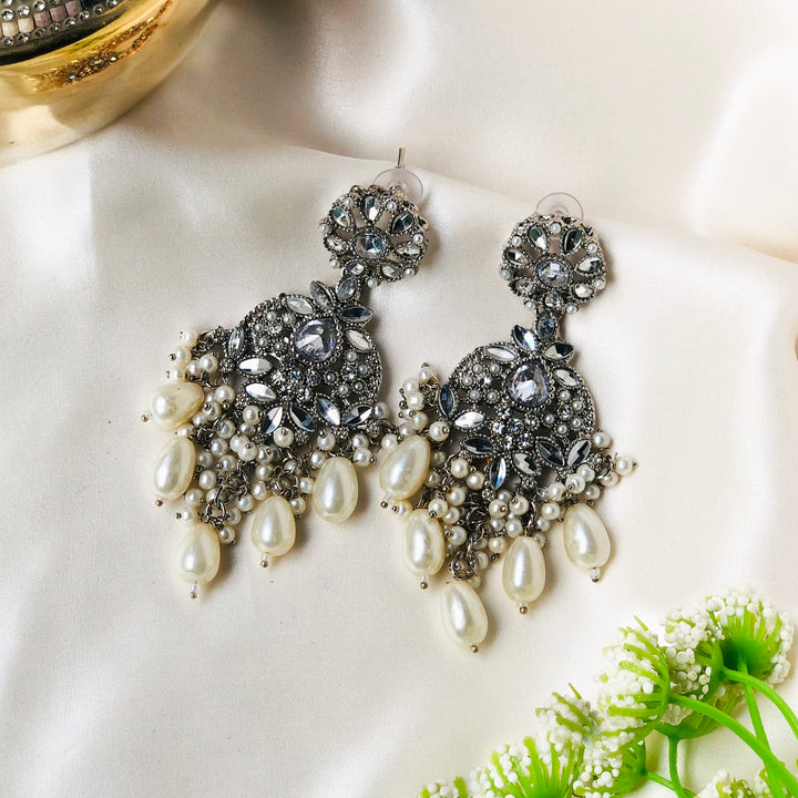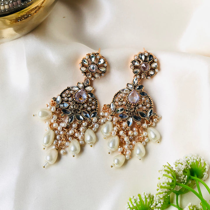 Indulge in the radiant allure of the Mah e Nur Royal Pearl & Crystals Earrings ER-85. These exquisite earrings capture the essence of timeless elegance, blending the classic beauty of pearls with the dazzling sparkle of meticulously placed crystals. Inspired by the celestial glow of 'Mah e Nur' (Moonlight), these earrings are designed to elevate your style with a touch of regal sophistication. Each earring features a delicate floral motif, adorned with lustrous pearls and shimmering crystals, cascading into a graceful chandelier design. Perfect for special occasions, weddings, or adding a touch of luxury to your everyday ensemble, these earrings are a testament to refined craftsmanship and enduring beauty."