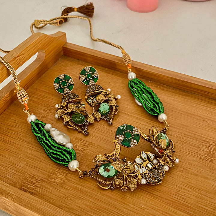 Indulge in the timeless elegance of our Hoorum Pearl Cascade Choker Set. This exquisite ensemble features a stunning choker adorned with cascading pearls, meticulously crafted to create a mesmerizing waterfall effect. The matching earrings complement the choker perfectly, completing the look with delicate pearl accents. Inspired by the rich heritage of Indian jewelry, this set exudes opulence and sophistication.