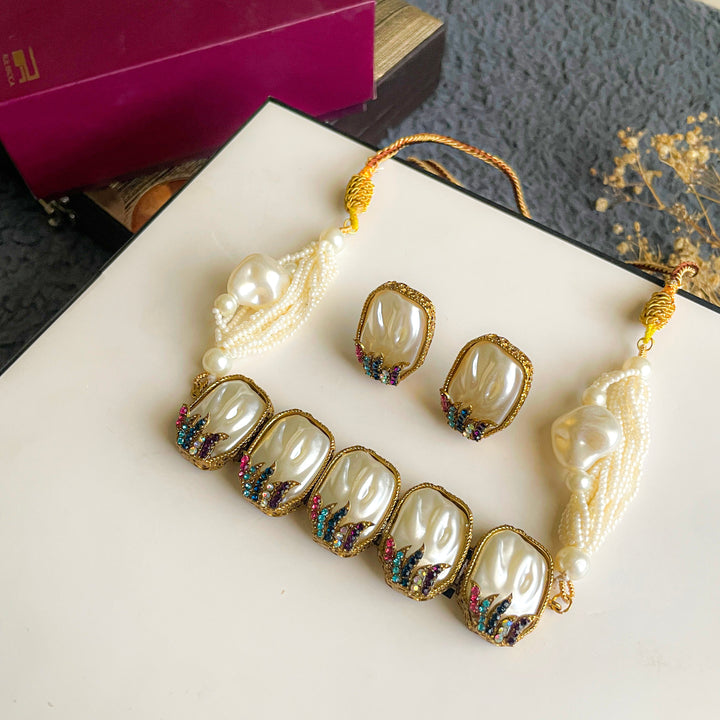 Indulge in the timeless elegance of the Husn-e-Janan Pearls Perfection Choker Set CS-51. This exquisite set is a masterpiece of intricate craftsmanship, adorned with lustrous pearls and sparkling crystals. The choker style necklace and matching earrings create a stunning ensemble that is perfect for any special occasion.