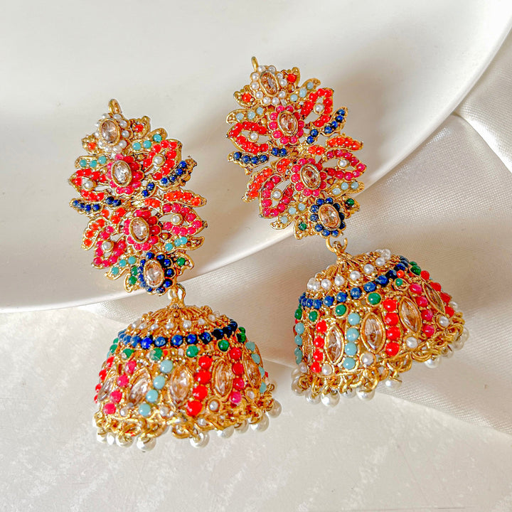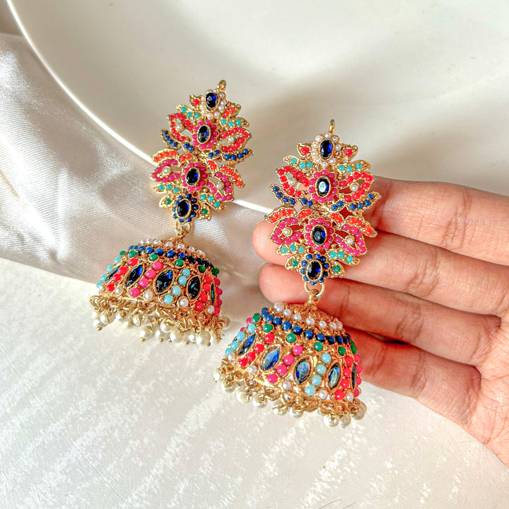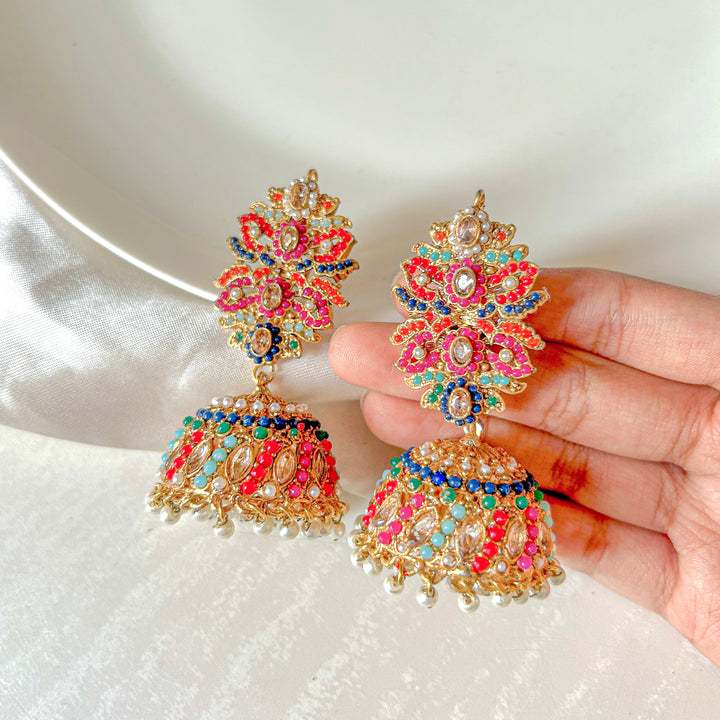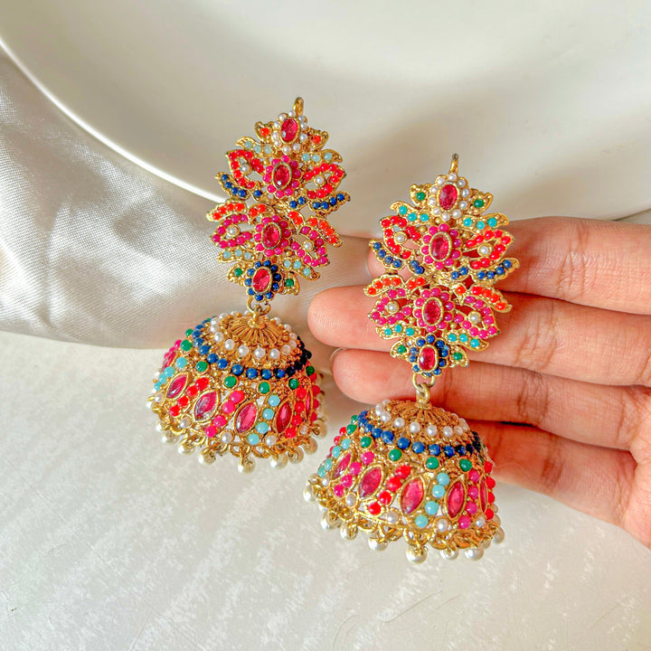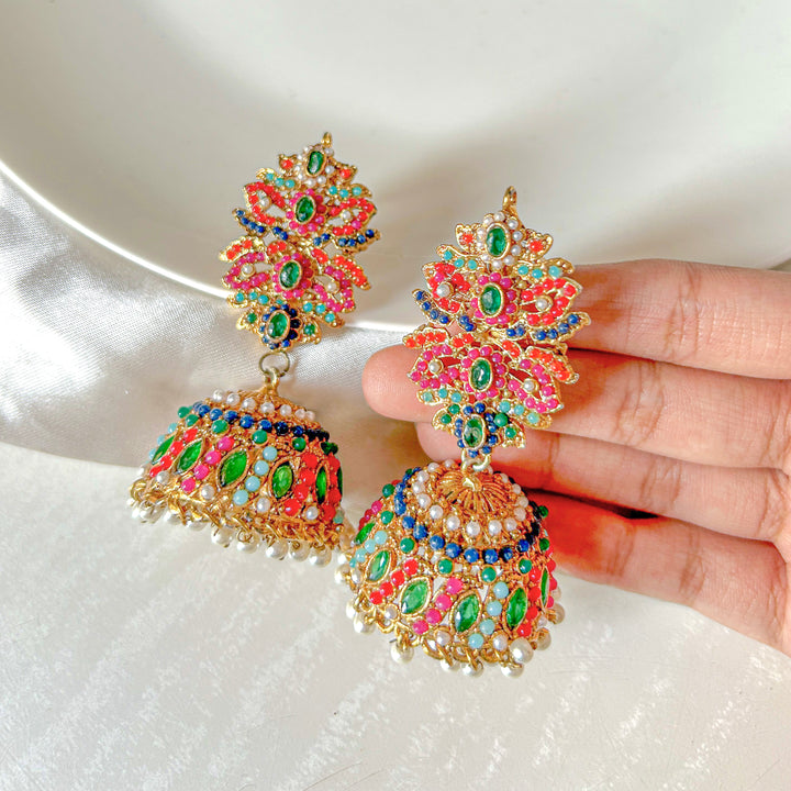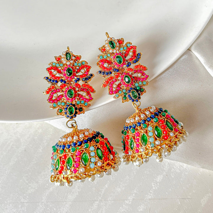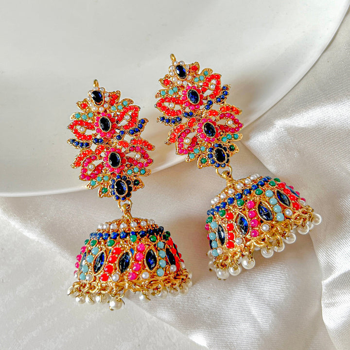 Classic jhumka silhouette infused with vibrant artisanal detailing