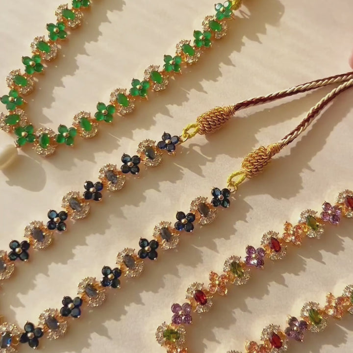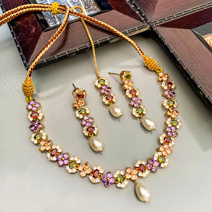 Elevate your elegance with the Khushbu Graceful Garden Necklace Set, a mesmerizing blend of floral charm and radiant gemstones. Designed to add a touch of sophistication and grace, this handcrafted set features multi-colored crystals and pearls, beautifully arranged in a floral pattern. The intricate gold-tone finish enhances its regal appeal, making it a perfect accessory for weddings, festive occasions, and special celebrations.