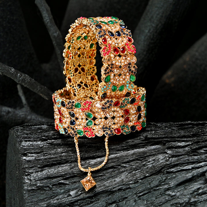 Indulge in a burst of color and opulence with the Multicolor Majesty KB Bangles - BN-31. This stunning ensemble of bangles is a symphony of vibrant hues and exquisite craftsmanship. Adorned with a dazzling array of precious stones, these bangles radiate regal elegance and unparalleled style.