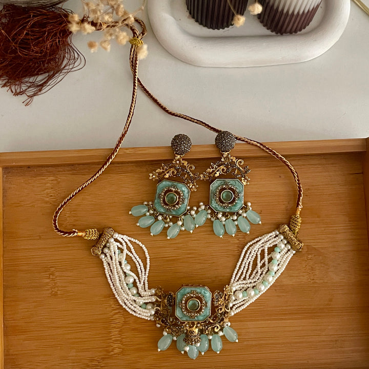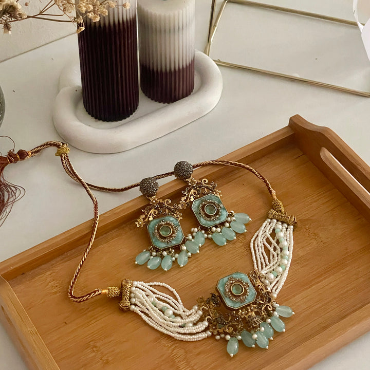 Elevate your style with the exquisite Naureen Half Choker Set. This stunning piece features a half-collar design adorned with intricate meena work in a captivating shade of blue. The centerpiece is a mesmerizing square-shaped pendant embellished with sparkling stones and a touch of turquoise. The set is completed with a pair of matching earrings that dangle gracefully, adding a touch of elegance to your overall look.