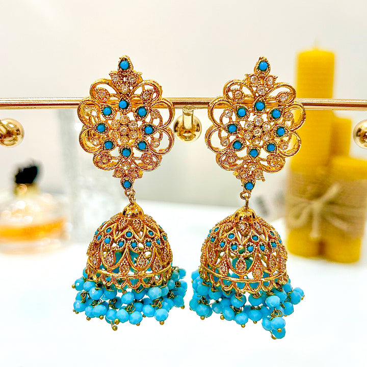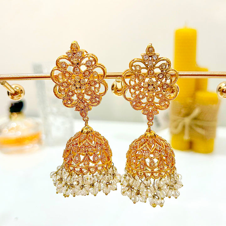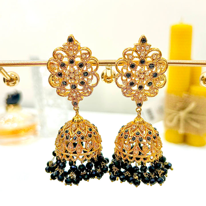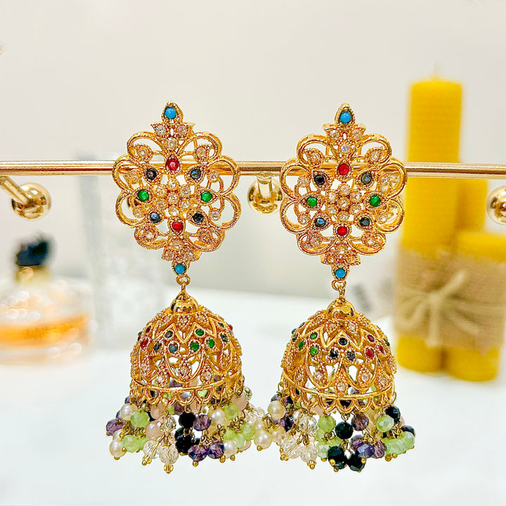 Design: Domed Jhumka with Filigree, Multi-Stone, and Bead Fringe Accents