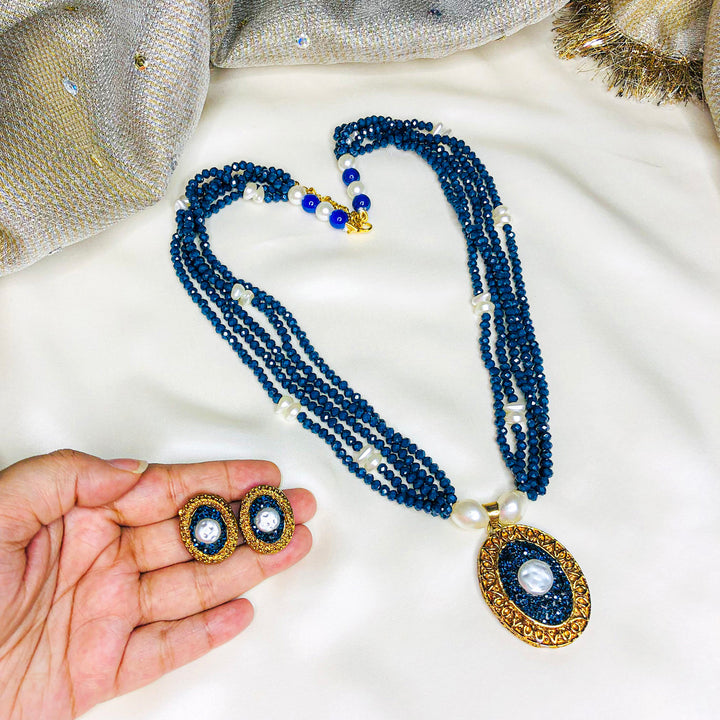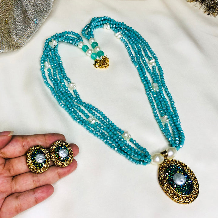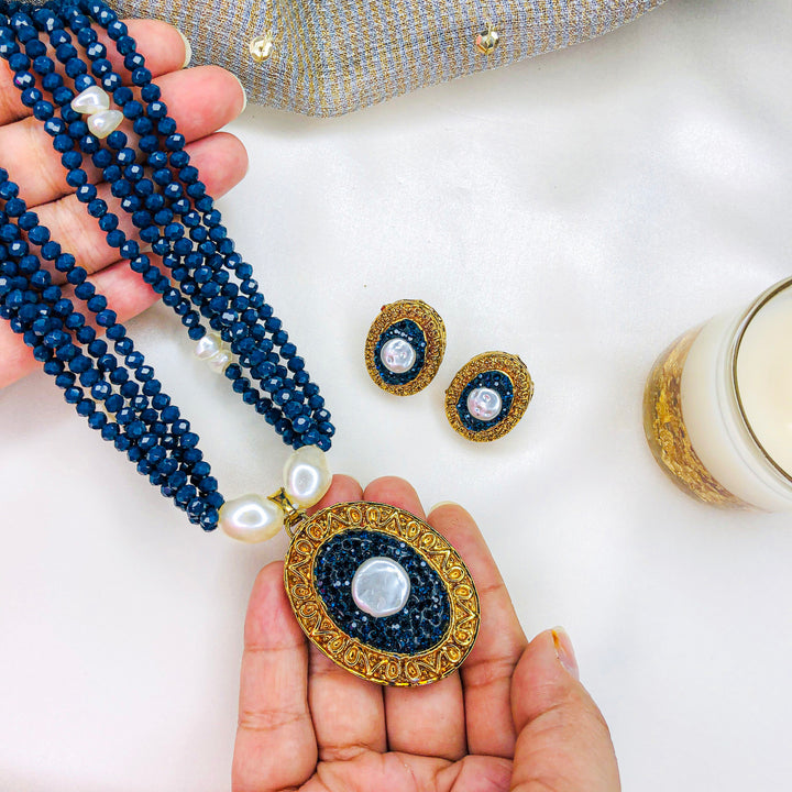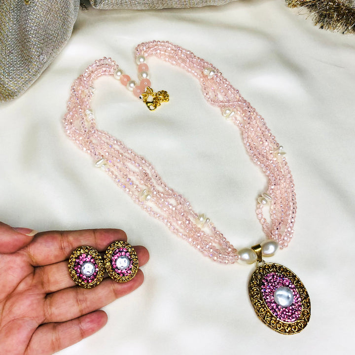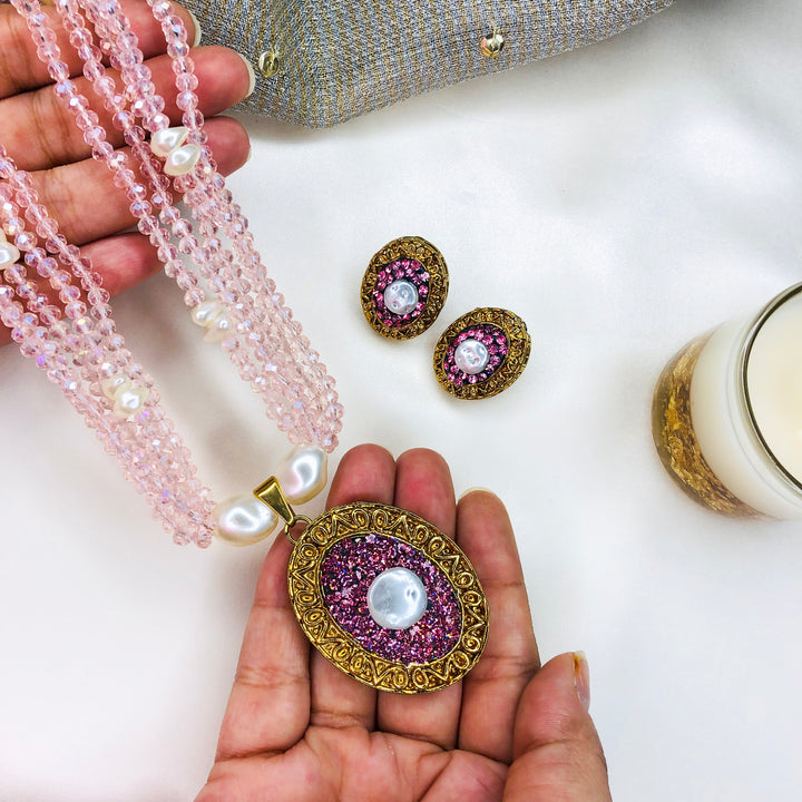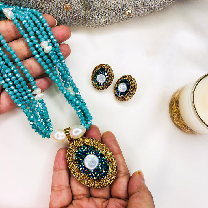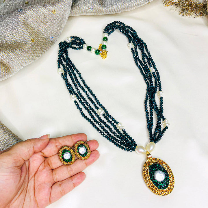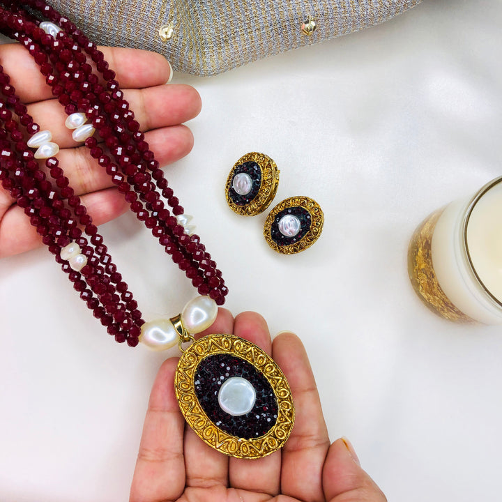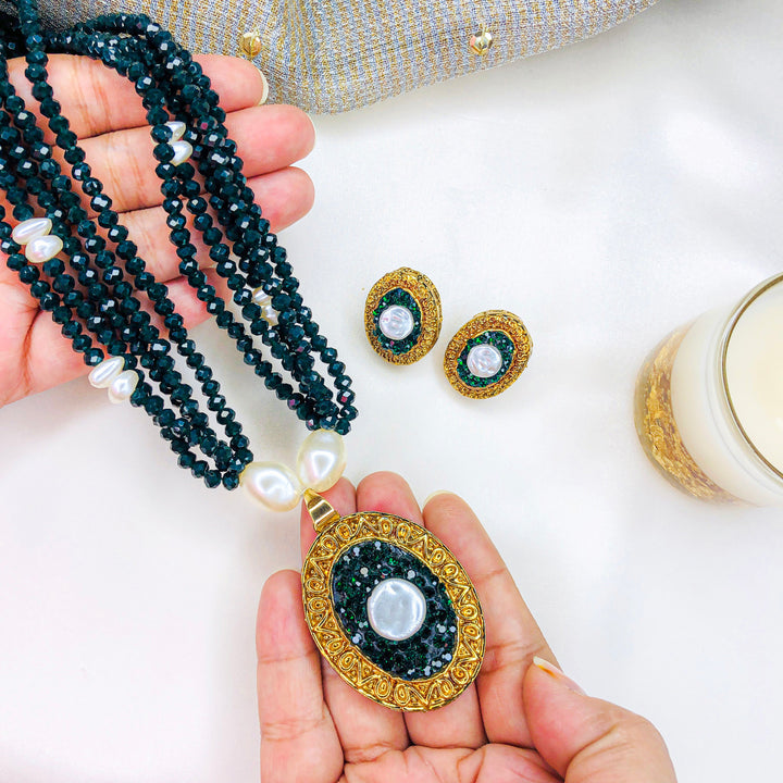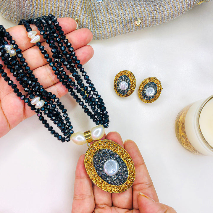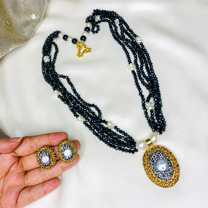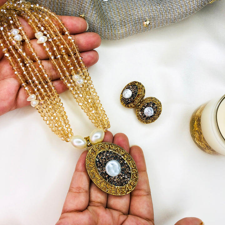 The Gul Mohar Mala Set – S-64 is a statement of timeless elegance, crafted for those who appreciate traditional artistry with a contemporary touch. This intricately designed set features a multi-strand beaded necklace complemented by a bold central pendant. The pendant showcases a finely detailed antique gold frame, encrusted with faceted stones and centered with a luminous pearl accent. The coordinated earrings echo the same craftsmanship, creating a cohesive and regal aesthetic. Ideal for formal occasions, cultural events, or celebrations, this set effortlessly enhances ethnic ensembles with sophistication and grace.