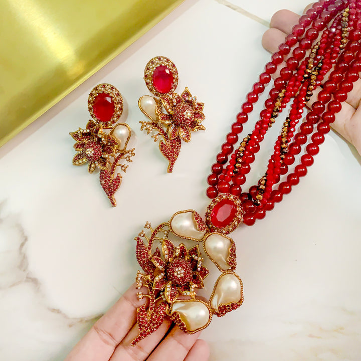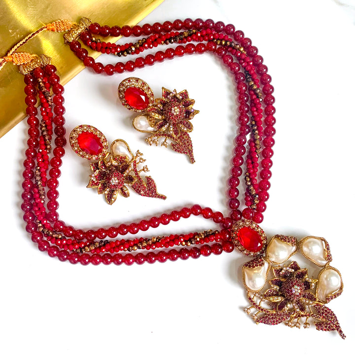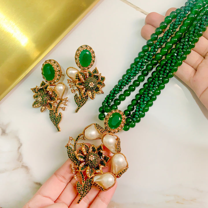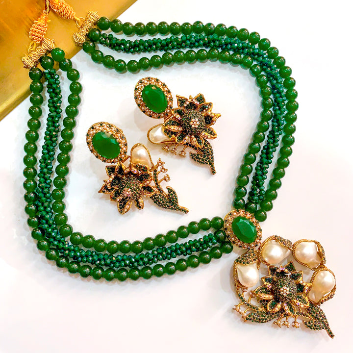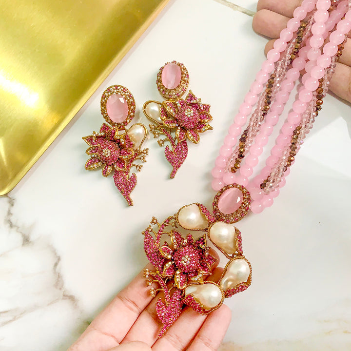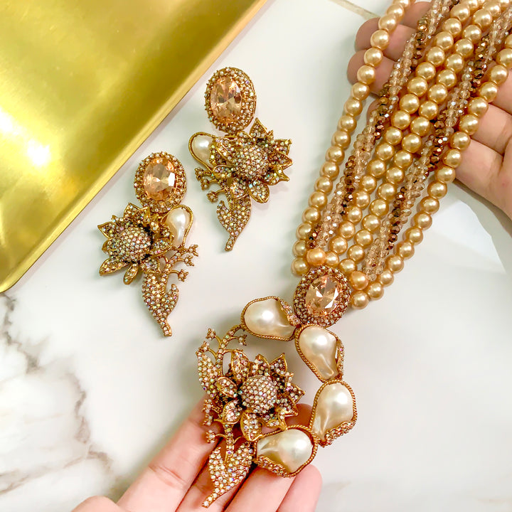 The design unfurls in layered strands, each bead a soft echo of earth’s abundance. At its heart rests a floral medallion, petals glistening with delicate pavé work, framed by luminous pearl-like droplets that catch the light like morning dew. Matching earrings carry the same botanical grace, their blossoms opening toward the gaze, every curve traced with artisan precision. The tones move with organic depth, weaving richness and softness into a single, flowing statement.