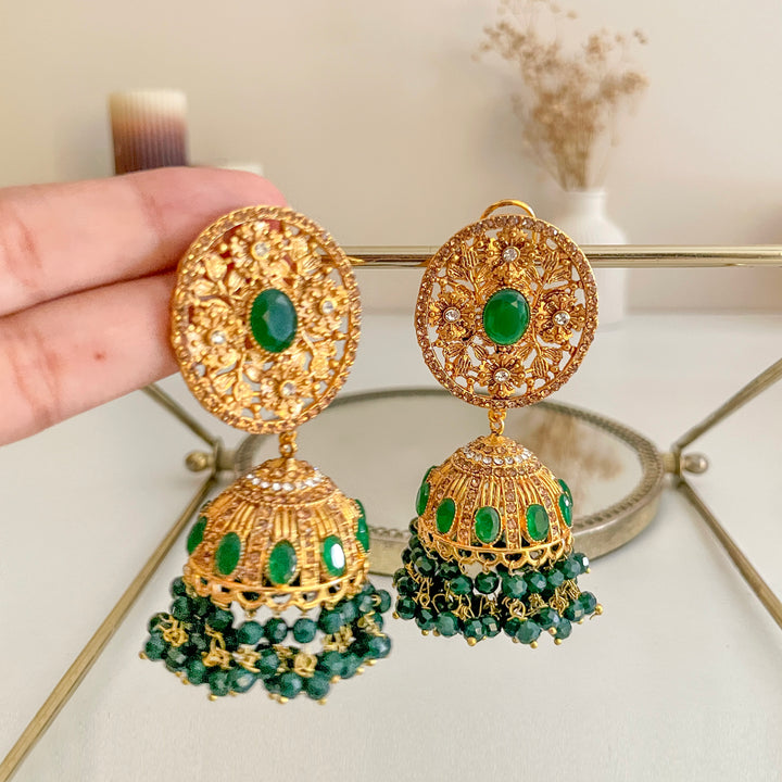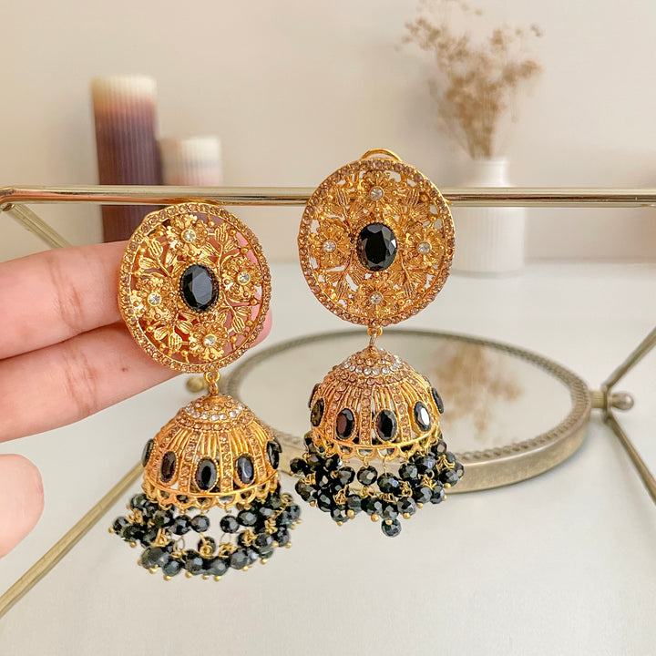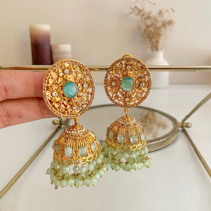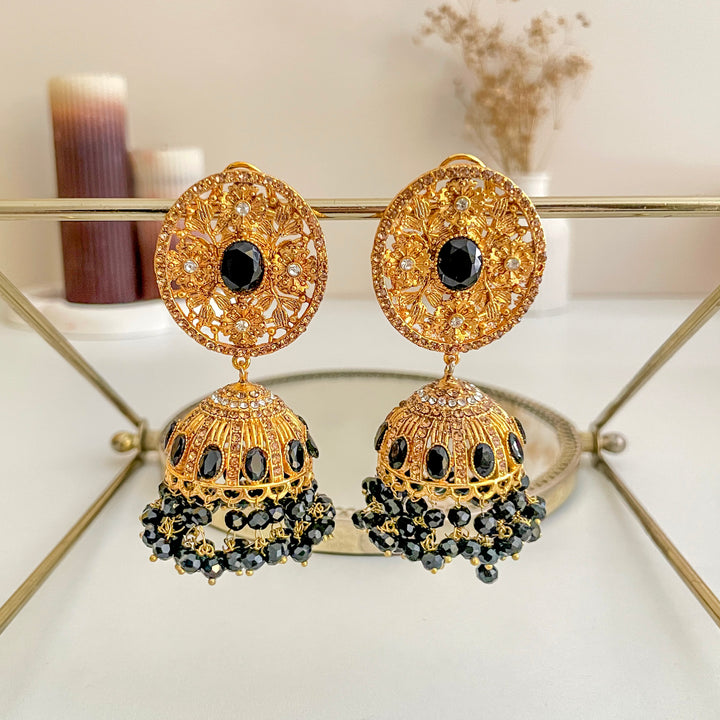 A magnificent echo of heritage, the Zarafshan Jhumkas are inspired by the golden domes and illuminated artistry of ancient royal courts. They embody a lavish yet graceful femininity, capturing the profound cultural symbolism of adornment in motion. These pieces are a celebration of light, designed to move with a gentle, melodic chime, turning every gesture into a moment of radiant elegance.
