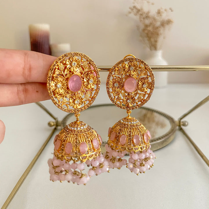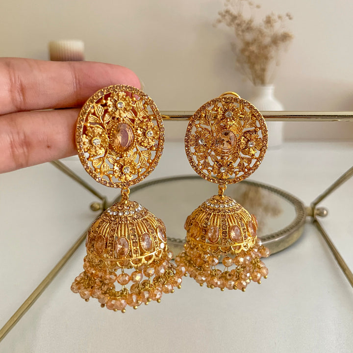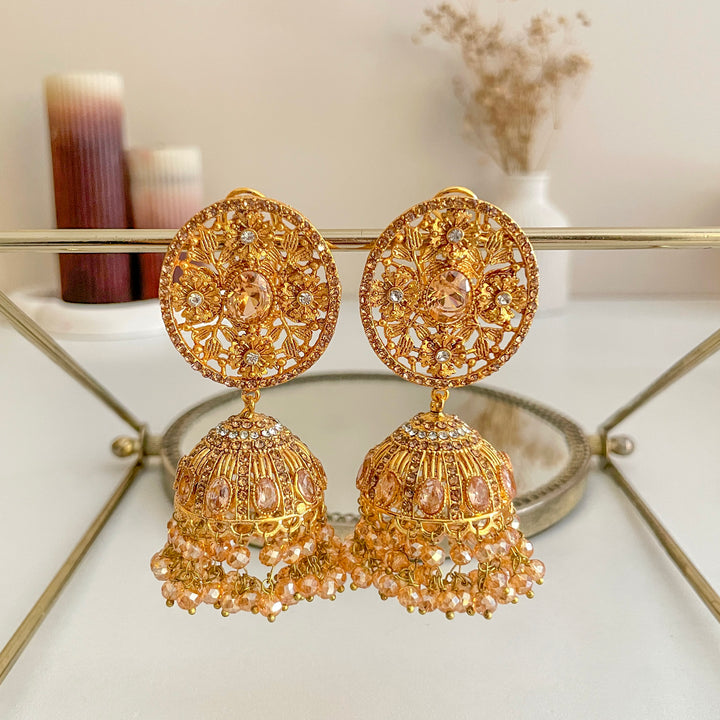 Design: Domed Jhumka with Filigree, Crystal, and Pearl Accents